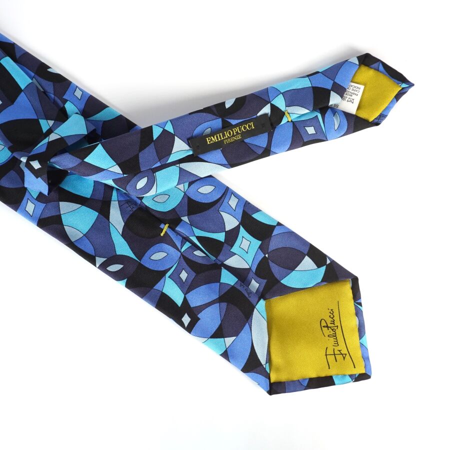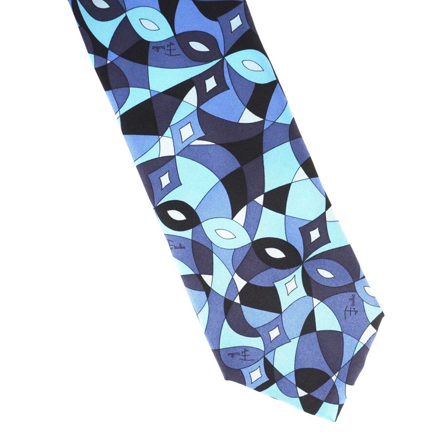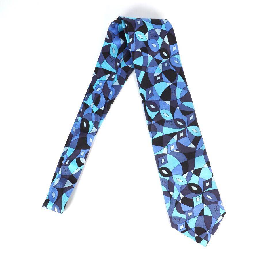 Emilio PUCCI : Cravate en soie à décor de formes géométriques en camaïeu de bleu, signée, Lar. 9 cm.