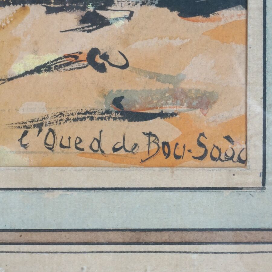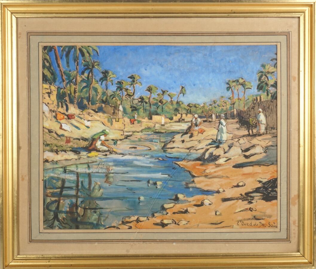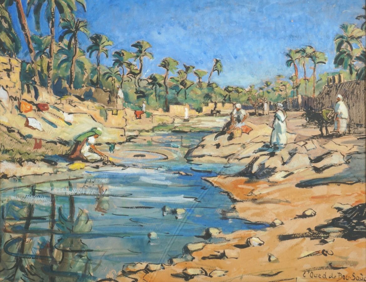 Emmy LEUZE-HIRSCHFELD (1884-1973), "L'Oued de Bou-Saâsa, Algérie", gouache sur papier, située en bas à droite, 29 x 37 cm (à vue) (verre fendu).