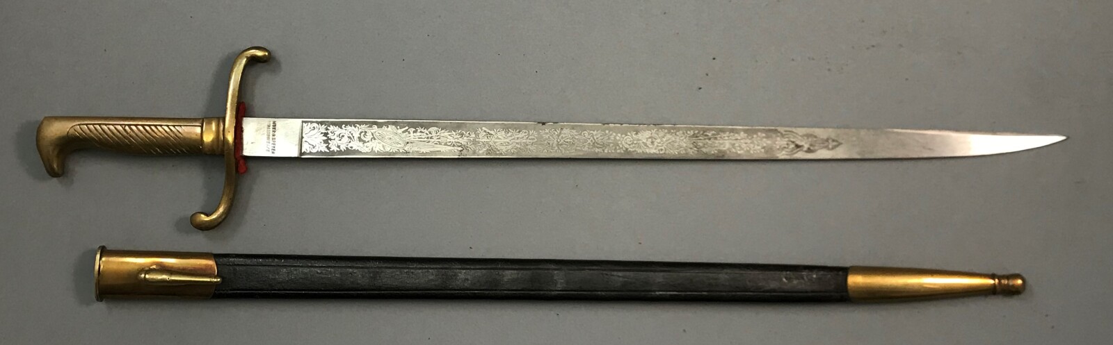 EMPIRE ALLEMAND - BAIONNETTE DE SORTIE NON REGLEMENTAIRE SUR LE MODELE 1871 DE FABRICATION FRANCAISE, poignée laiton à un côté strié, l'autre lisse, absence de système de fixation. Longue lame droite plane gravée à l'acide de feuillage et de symboles militaires, marquée au talon " MOHR & SPEYER STRASSBURG " fourreau en cuir noir à garnitures en laiton, BE/TBE.