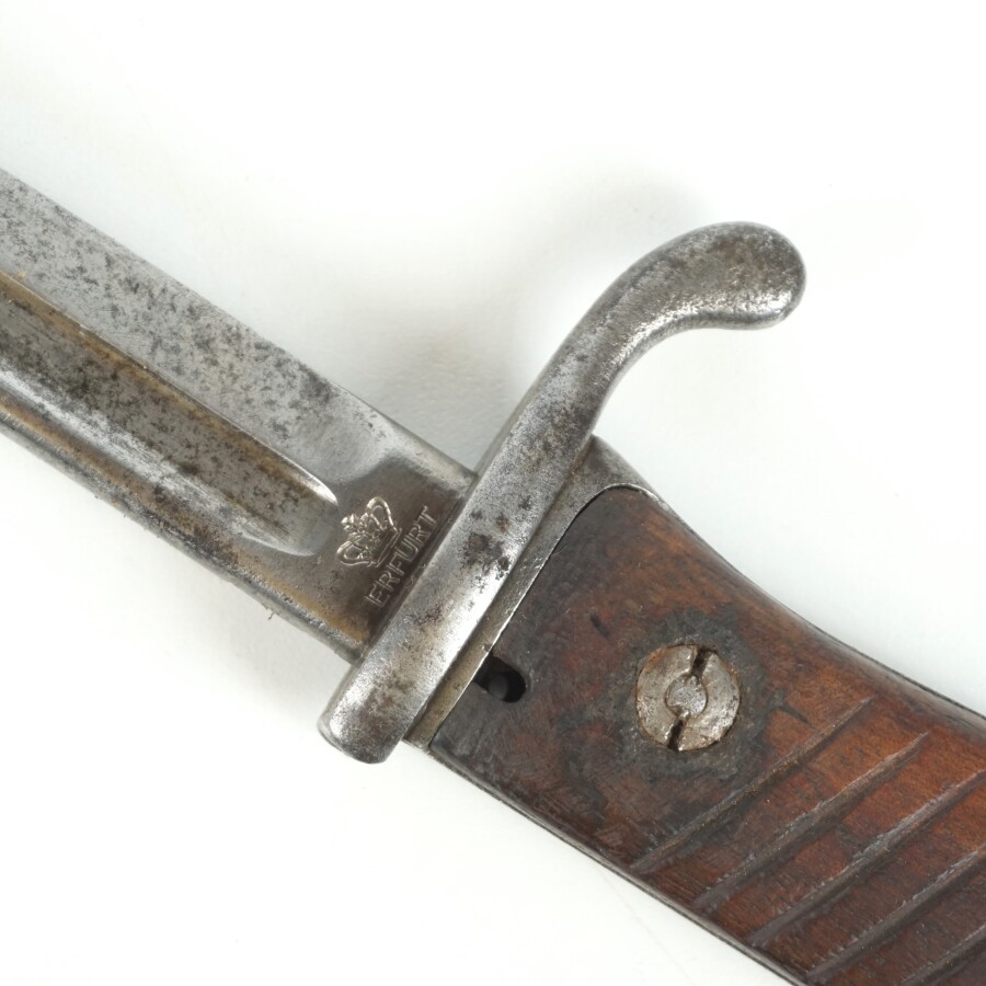 EMPIRE ALLEMAND - BAIONNETTE MODELE 1898, quillon court et embryon de douille, plaquettes de la poignée en bois à 9 rayures, marquage régimentaire sur la croisière " 120 R 134 ", fine lame piquée à pans creux en langue de carpe à dos rond, fourreau en cuir à garnitures en acier régimenté " 103 R10 ?? ", ABE.
