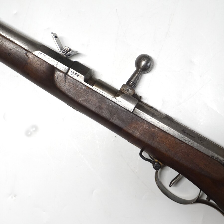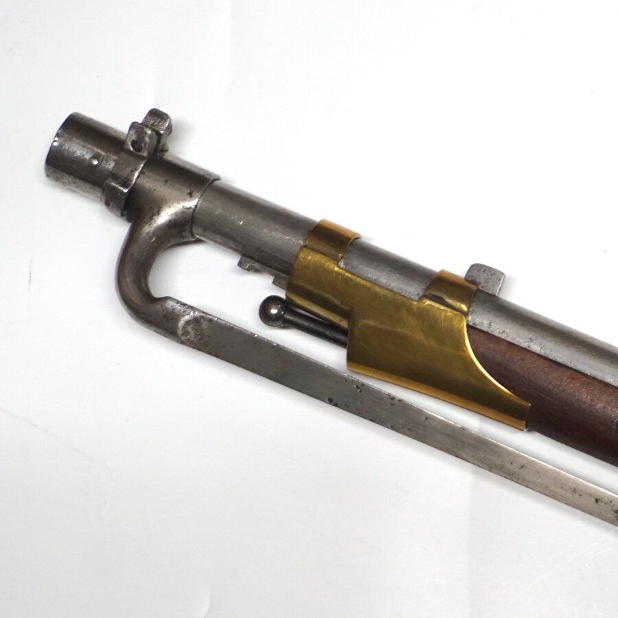 EMPIRE ALLEMAND - FUSIL DREYSE A AIGUILLE MOD 1841, boitier de culasse marqué " Soemmerila ND ", " Mod. 41 ", daté " 1860 " et " 1866 ", canon rond à pans poinçonné au tonnerre de 90 cm, garnitures en laiton hormis la plaque de couche en fer matriculée " 65 RE 4242 ", monture à joue en noyer, baguette en fer à embout en boule, longueur totale : 142 cm, avec la BAIONNETTE A DOUILLE correspondante, ABE/BE.