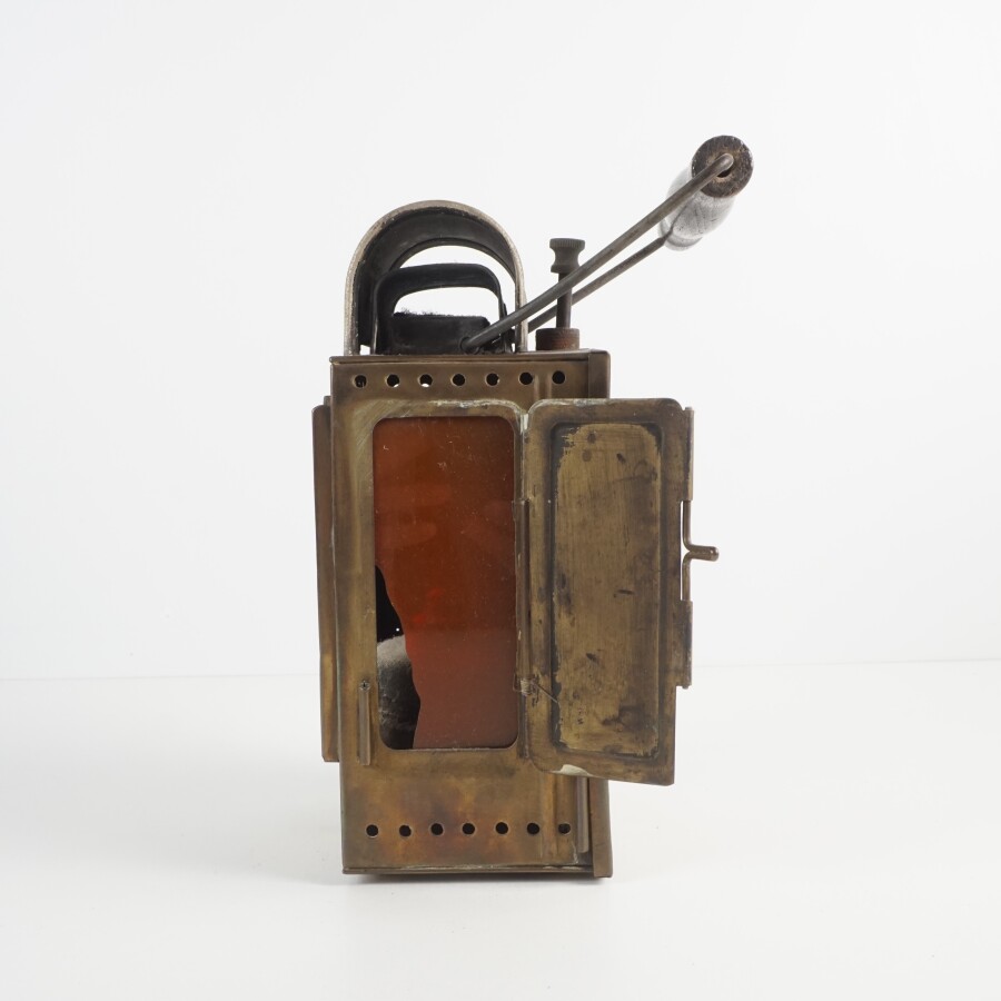 EMPIRE ALLEMAND - LANTERNE à carbure de la laternenfabrik heinrich gilet bergzabern, verres de couleur rouge et vert de part et d'autre du verre central opaque, manque au-niveau du verre de couleur rouge et sans le bouchon du réservoir, Première Guerre Mondiale, BE.