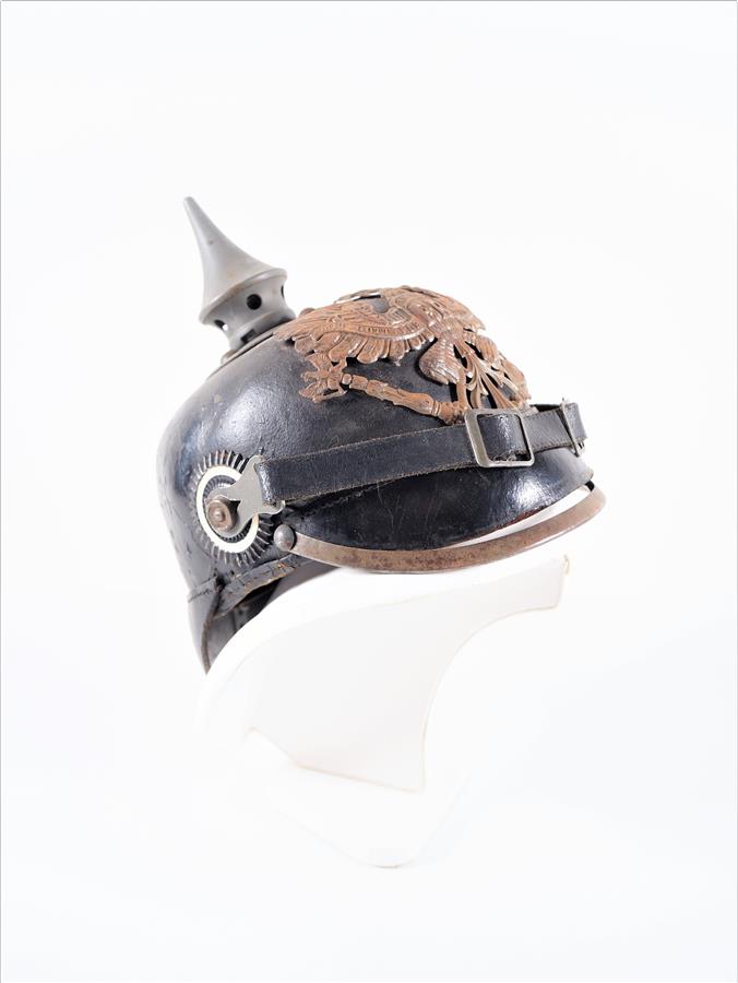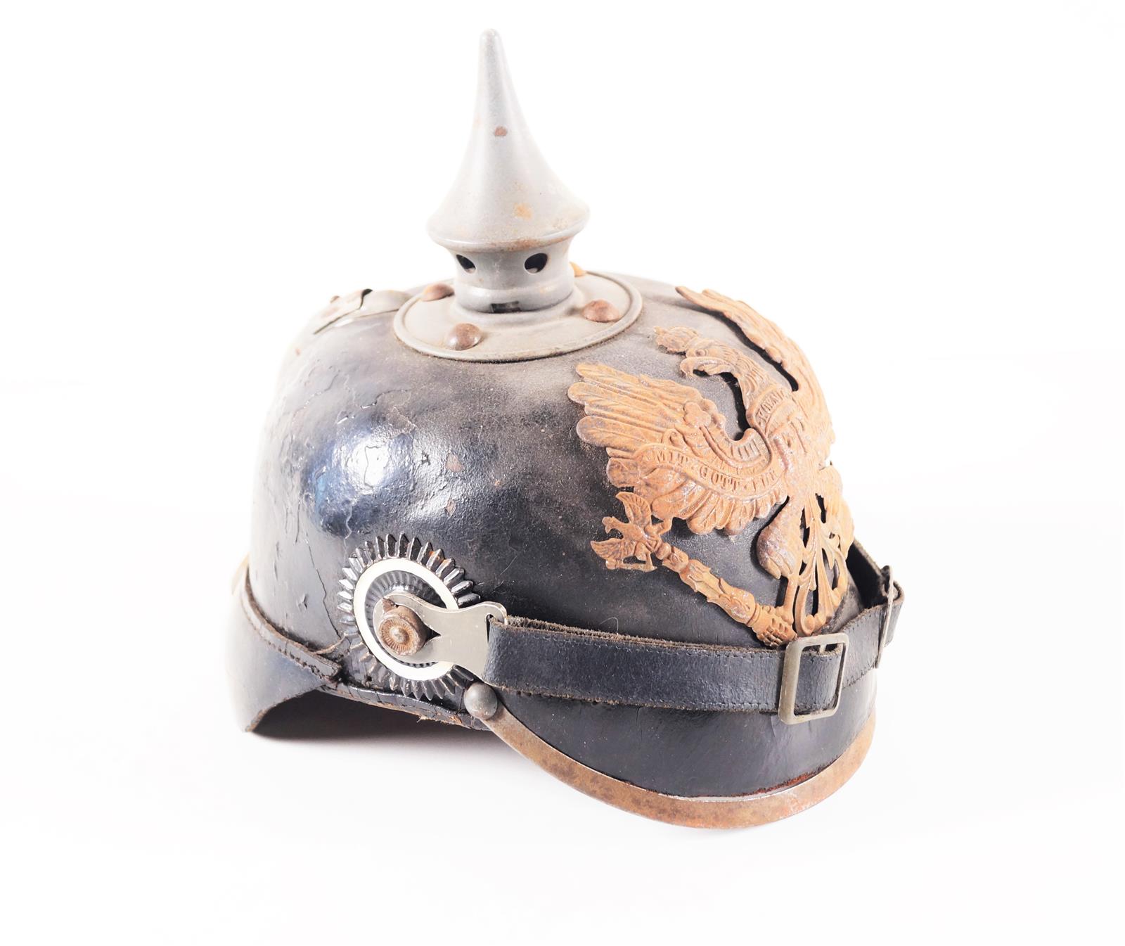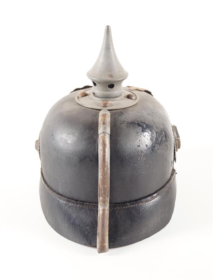 EMPIRE ALLEMAND - ROYAUME DE PRUSSE - CASQUE A POINTE POUR LA TROUPE MODELE 1915, bombe, visière et protège-nuque en cuir noir, plaque oxydée en fer, pointe, embase et jonc en métal gris, cocardes peintes, jugulaire en cuir noir, coiffe intérieure en cuir noir, absence de marquages régimentaires, ABE.