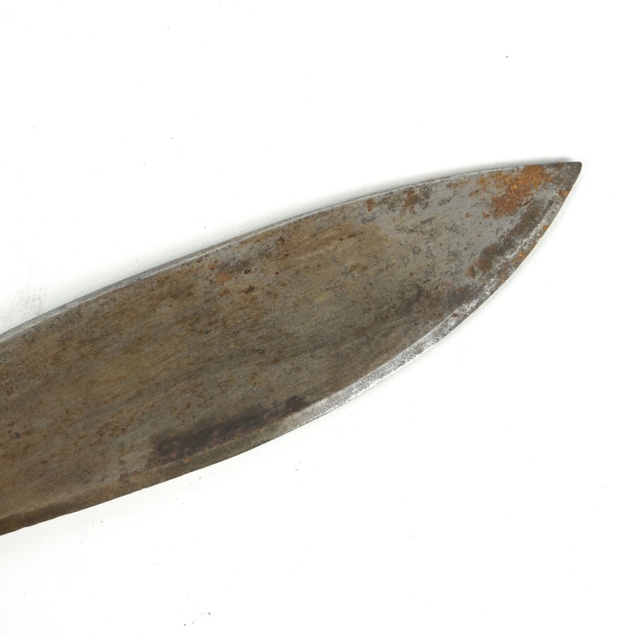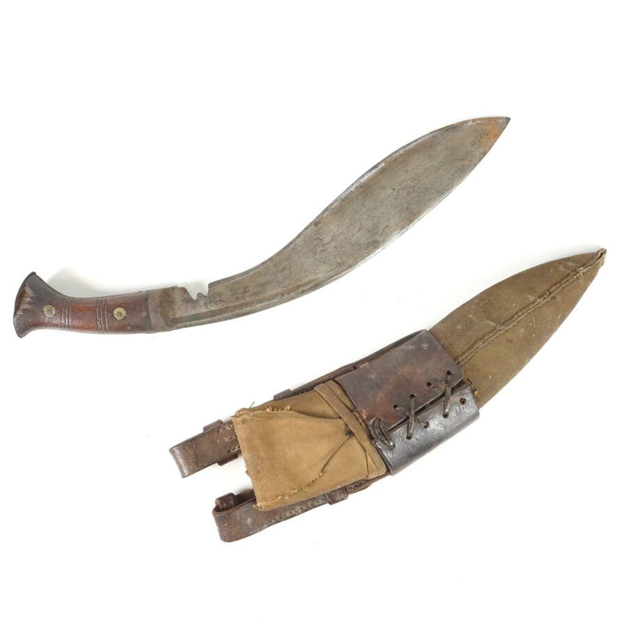 EMPIRE DES INDES - KUKRI REGLEMENTAIRE, poignée en bois, forte lame de 32,5 cm marquée au talon " PIONEER CALCUTTA " et " 43 ", fourreau gainé de toile verte, PORTE-FOURREAU en cuir marron lacé sur le devant, Seconde Guerre Mondiale, BE.
