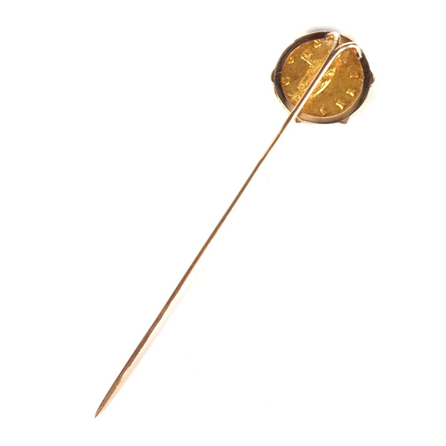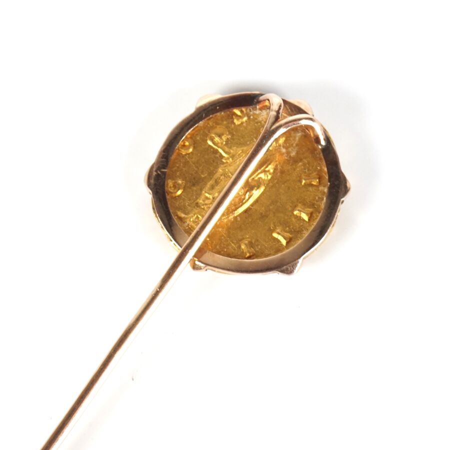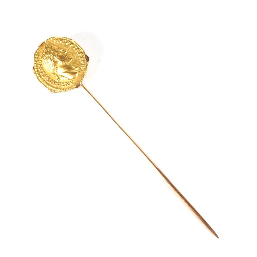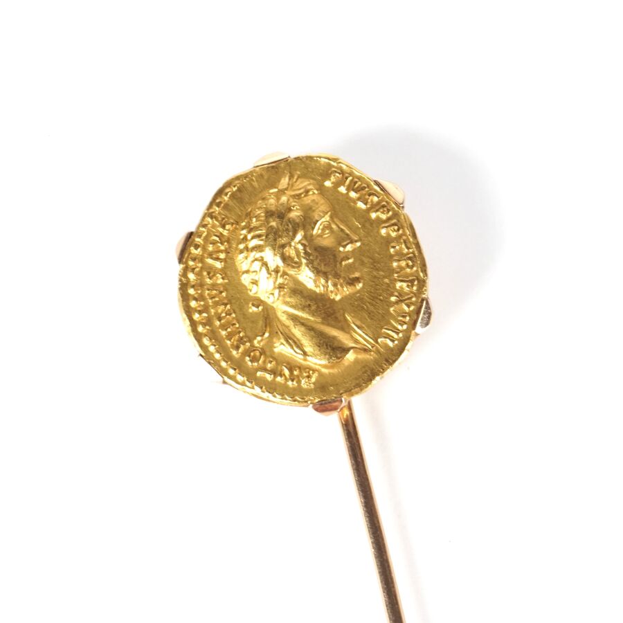 EMPIRE ROMAIN : Antonin Le Pieu (138-161 ) Auréus, Rome 150-151 : A/ Portrait de l'empereur lauré à droite. ANTONINUS AUG PIUS PP TRP XVII, R/ Antonin debout à gauche tenant un globe dans la main droite et un volumen de la gauche. COS IIII. Monnaie montée en épingle en or jaune 18K (750/oo), Poids brut total : 10,5 g environ. Poids de la monnaie : 7 g environ (rayures, traces de montures sur la tranche).