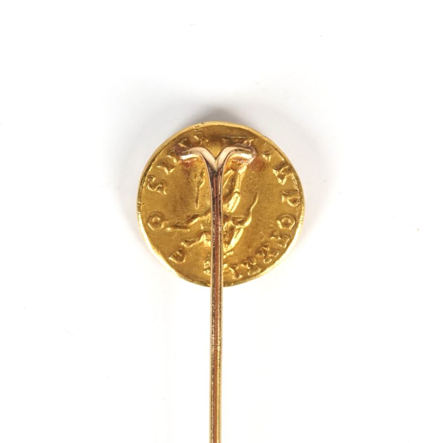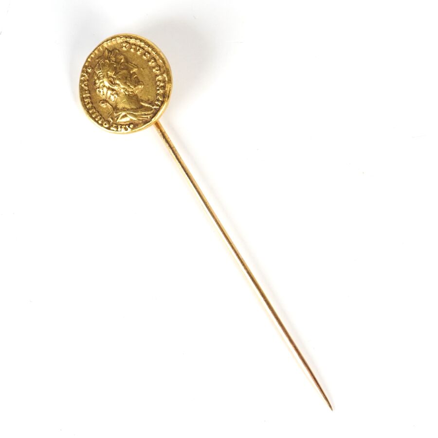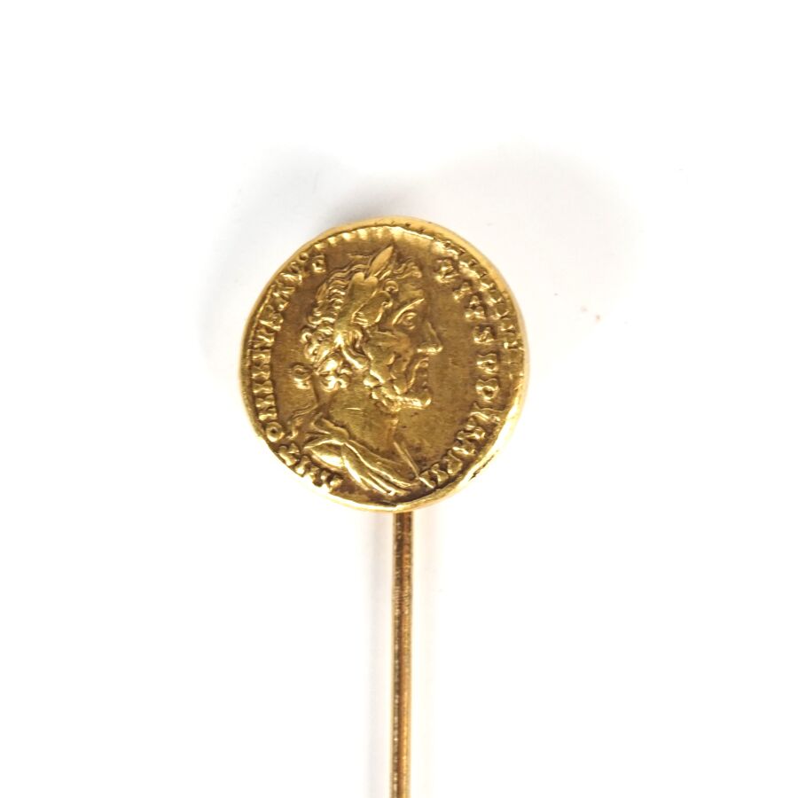 EMPIRE ROMAIN : Antonin Le Pieu 138-161, Aureus Rome 157-158, montée en épingle de cravatte en or jaune 18K (750/oo) : A/ Portrait lauré à droite " ANTONINUS AUc PIUS PP IMP II ", R/ La Santé à droite, une patère dans la main droite et nourrissant un serpent de la gauche "(T)R POT XXI COS IIII". Poids brut : 8.40 g environ.