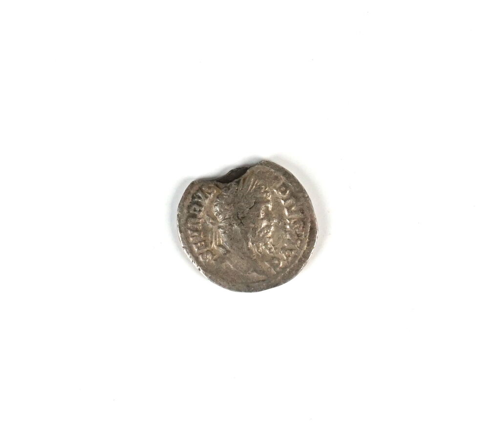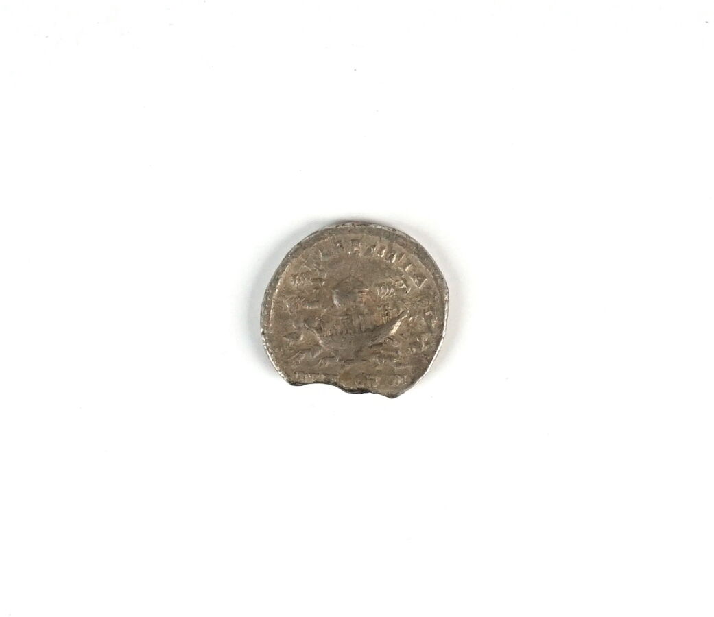 EMPIRE ROMAIN : Denier de Septime Sévère, Argent : A/ Severus Pius Aug, portrait à droite, R/ Galère entourée de quadrige et d'animaux, Laetitia (temporum), Rome 206, probablement un faux ancien, Poids brut : 2,55 g environ (flan cassé, manque).