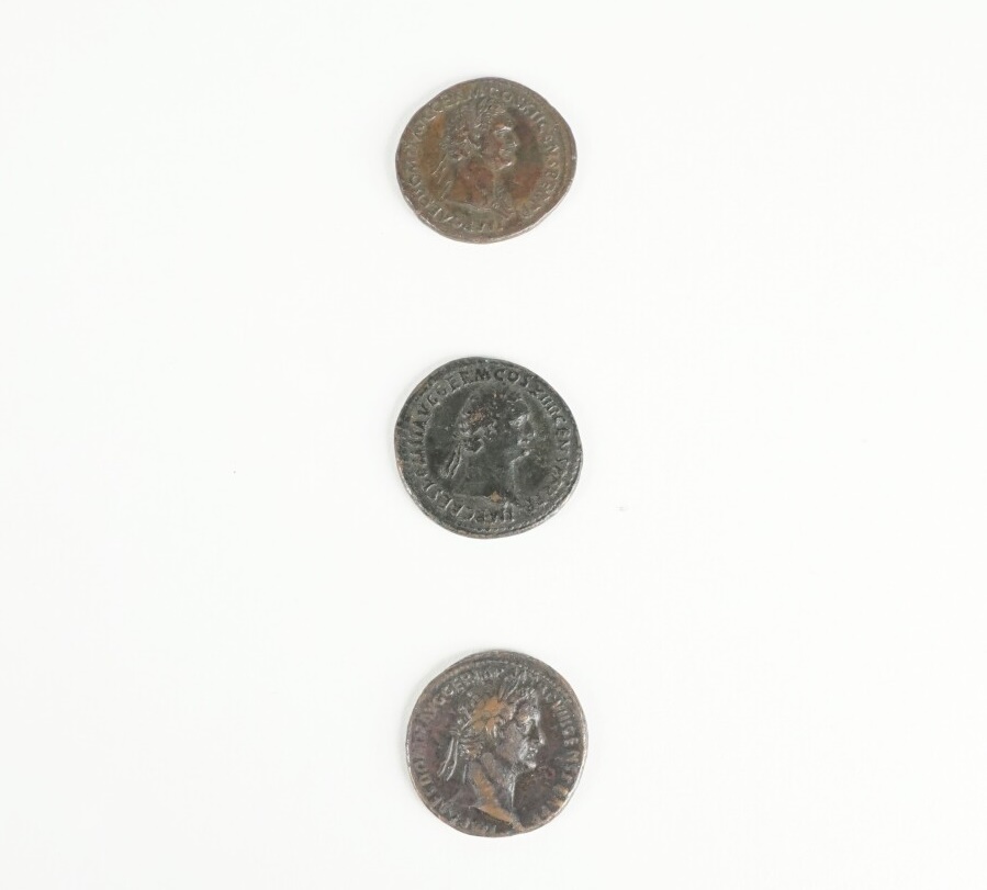EMPIRE ROMAIN : Domitien (81-96) : Lot de 3 As, bronze et cuivre, R/ FORTUNAE AUGUSTI SC // VIRTUTI AUGUSTI SC // COS XIIII SAEC FEC SC revers rare (année 88), T+ à TTB.