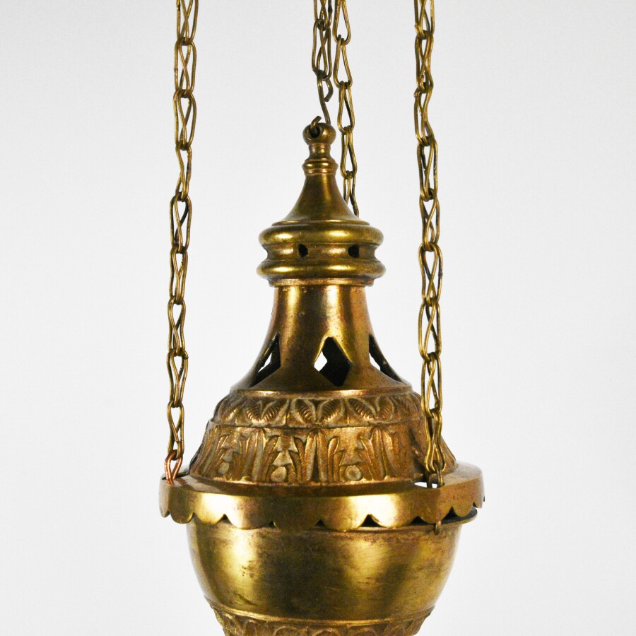 Encensoir en bronze doré et ciselé à motif de frises végétales stylisées, fin du 19e siècle, H. 21 cm. H. totale : 100 cm.