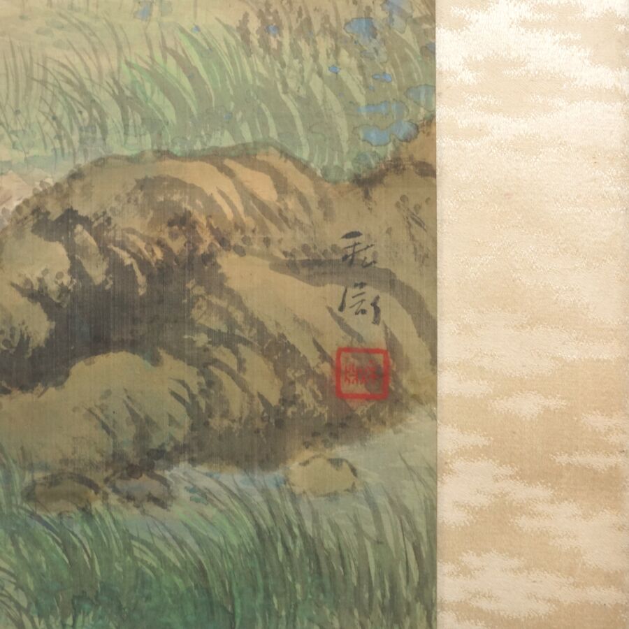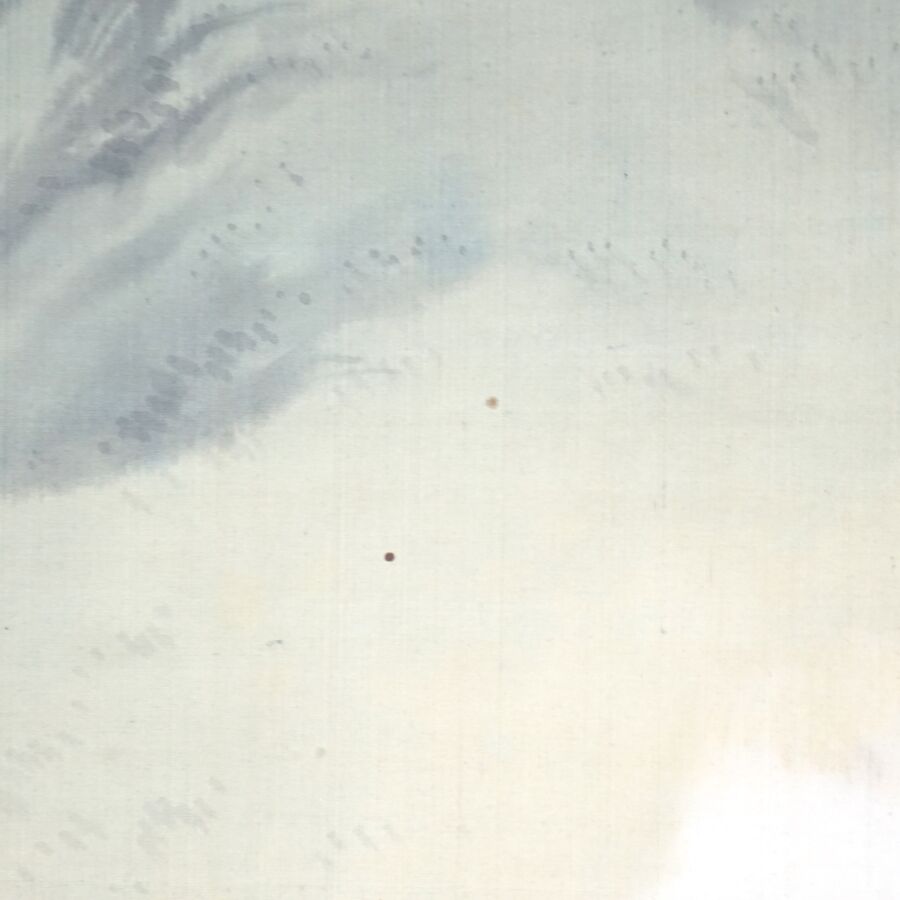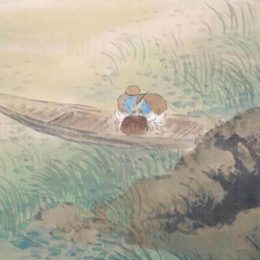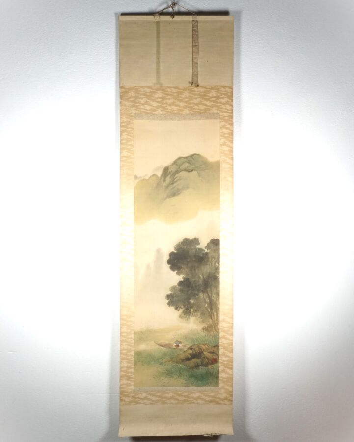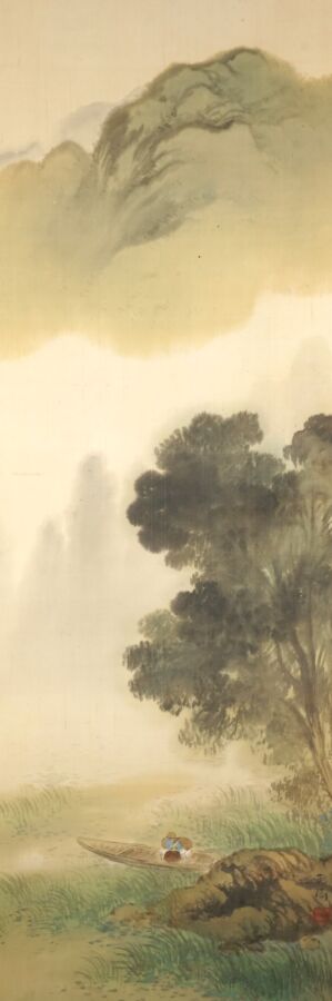 Encre et couleurs, représentant un pêcheur dans sa barque sur fond de paysage montagneux, cachet en bas à droite et signée, monté en kakemono, Japon, Dim. Peinture : 126 x 403 cm (petites usures).