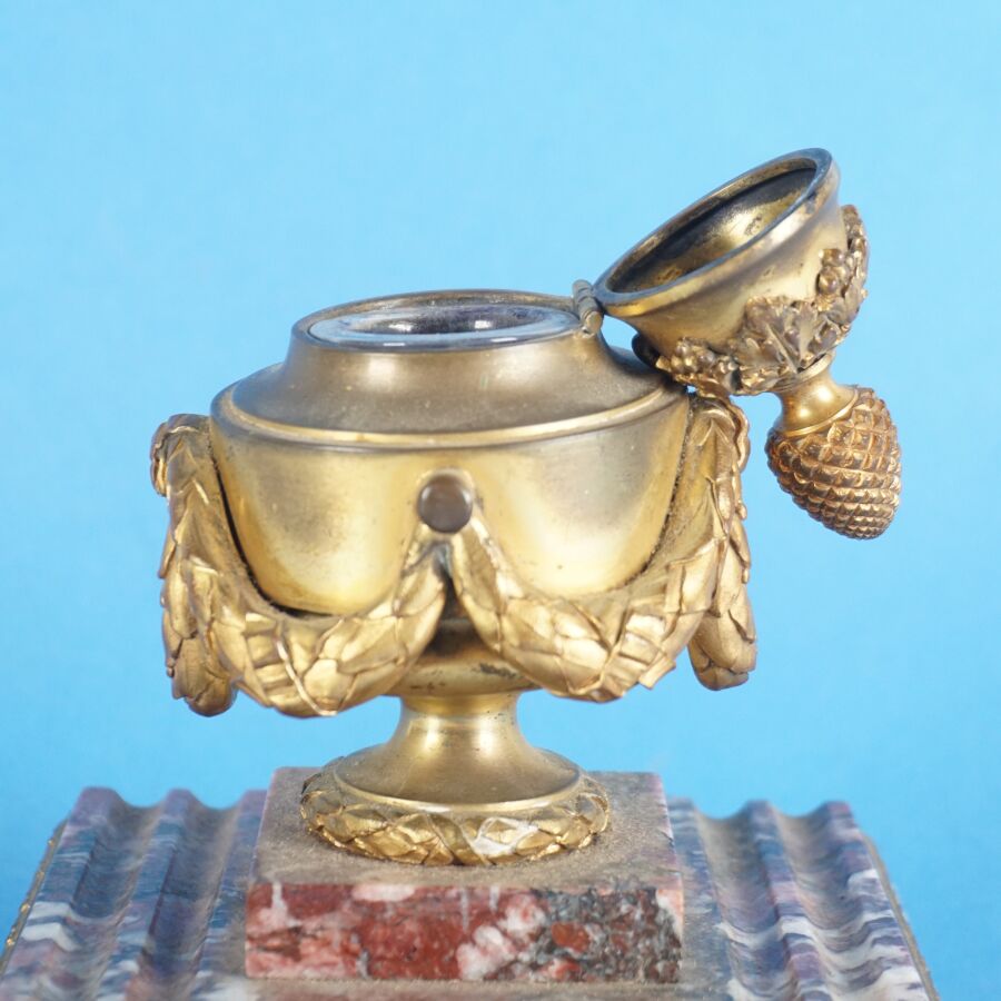 Encrier, bronze doré, à motif d'un vase sur piédouche orné de guirlandes de lauriers, la prise formant une pomme de pin, réservoir en verre (fêle), présenté sur un socle en marbre violet reposant sur quatre pieds toupies, 19ème siècle, H. 16.5 cm (quelques usures à la patine, égrenures au marbre).