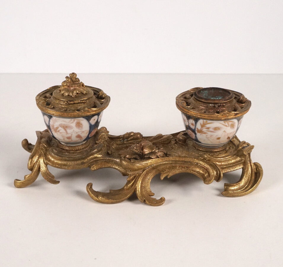 Encrier en bronze doré et ciselé de style Louis XV à décor rocaille, les réservoirs en porcelaine émaillée à décor Imari, L. 22 cm. H. 9 cm (manque une charnière à l'un des couvercles).