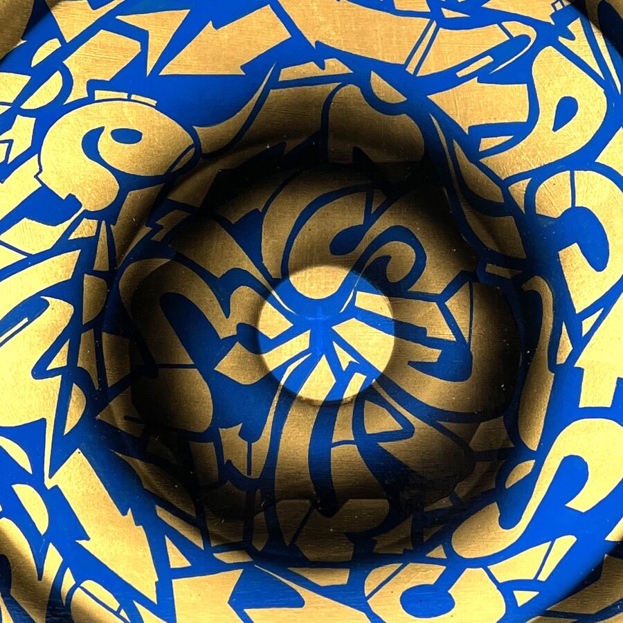 ENCS (1983), "Bleu gold", 2023, acrylique et marqueur sur toile coton, signée et titrée au dos, 70 x 50 cm.