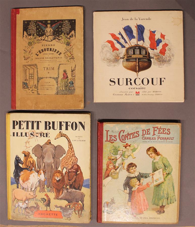 [ENFANTINA] - Ensemble de 4 livres d'enfants : PERRAULT (Charles) - Les contes de fées - Paris ; Veuve Magnin et fils, sans date [fin XIXème siècle] - 1 volume In-4° - Illustrations in et hors-texte en noir et couleurs - Reliure éditeur cartonnage illustré couleurs au 1er plat (coupes frottées, 1 petit accroc au 2nd mors) - Bon intérieur - TRIM - Pierre l'ébouriffé - Joyeuses histoires et images drolatiques pour les enfants de 3 à 6 ans - Paris ; Librairie Fischbacher, sans date [vers 1920] - Manque page de titre - Dessins in-texte en couleurs - Reliure éditeur cartonnage illustré au 1er plat (coupes usées, 2nd plat taché) - Dos toilé rouge - NAHMIAS (R.) - Petit Buffon illustré - Hachette ; 1929 - 1 volume In-4° - Dessins couleurs hors-texte de R. de la Nézière - Reliure éditeur cartonnage illustré au 1er plat (coupes frottées, 1ère charnière fendue) - Dos toile jaune - LA VARENDE (Jean de) - Surcouf corsaire - Paris ; Marcus ; 1947 - 1 volume In-8° carré - Illustrations in et hors-texte couleurs par Gustave Alaux - Reliure éditeur cartonnage illustré couleurs au 1er plat (1 petite tache à celui-ci) - Bon état.