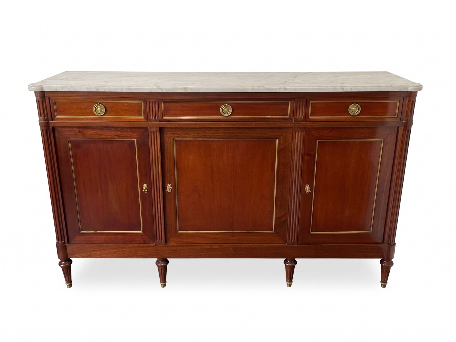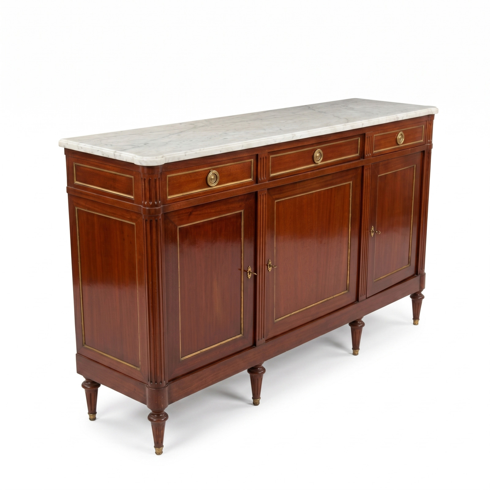Enfilade de style Louis XVI, en acajou et placage d'acajou, le plateau en marbre blanc, ouvrant par trois tiroirs en ceinture et trois vantaux en façade, les montants à cannelures, reposant sur quatre pieds fuselés, 105 x 168 x 46 cm.