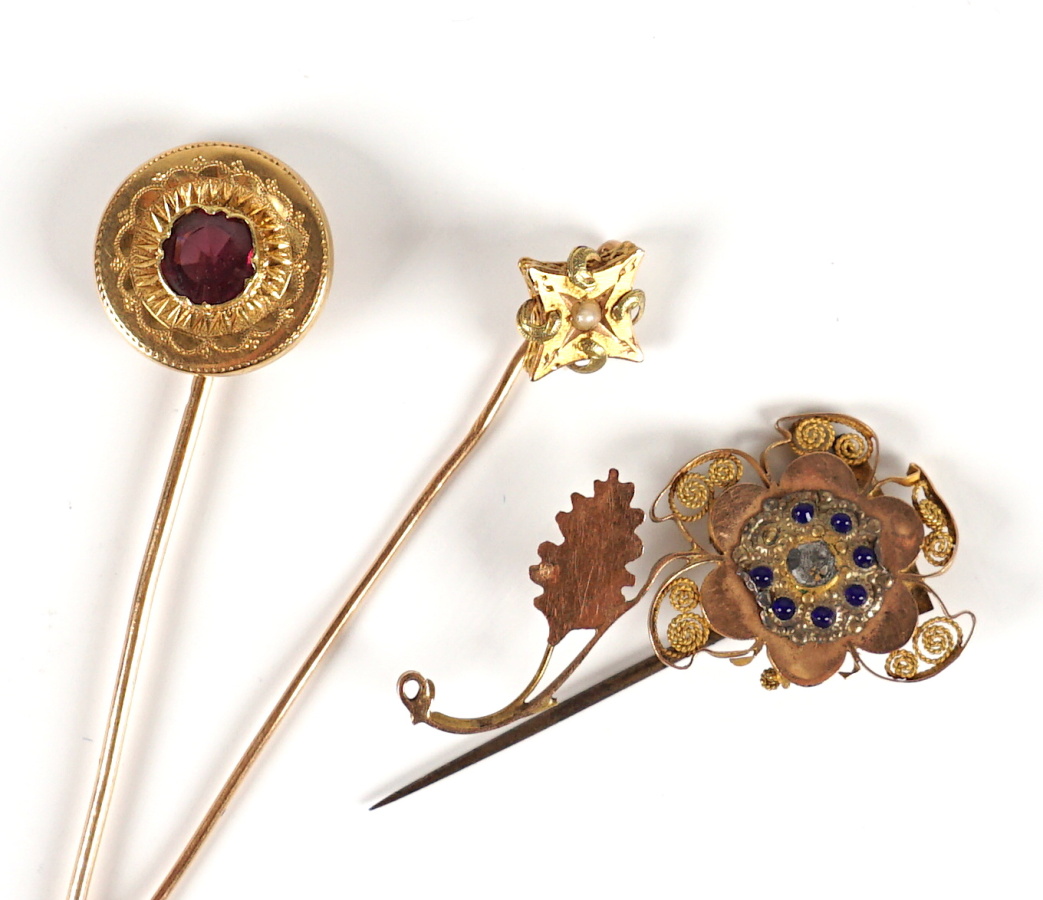 Ensemble comprenant 2 épingles à chapeau en or 18 K (750/oo), L. 6 cm environ, et une épingle "fleur" en or 18 K (750/oo) ornée de cabochons bleus et de motifs filigranés, en l'état, la branche en métal, L. 4 cm. Poids brut total: 4.3 g environ.