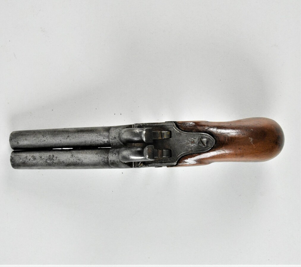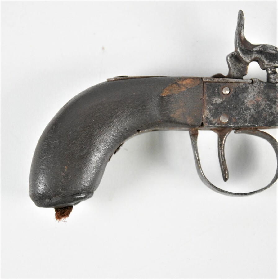 Ensemble comprenant 2 PISTOLETS COUPS DE POING A COFFRES dont un à deux canons en table, longueurs : 17 et 20 cm, vers 1840, DANS L'ETAT.