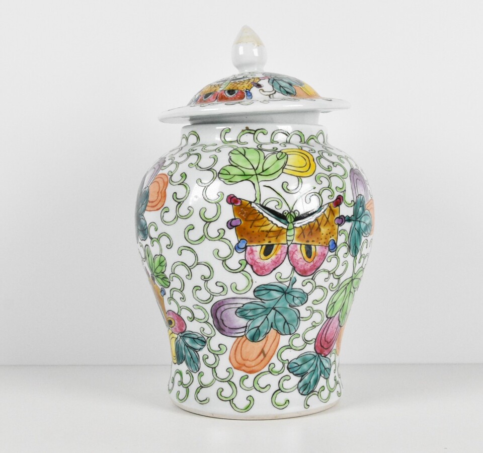 Ensemble comprenant 2 potiches couvertes en porcelaine émaillée polychrome, l'une de forme balustre et l'autre de forme boule, et une bonbonnière en verre avec son couvercle, H. de 15 à 23 cm (taches, petites usures).
