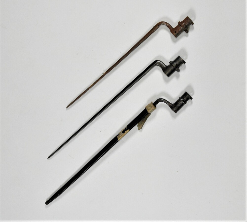 Ensemble comprenant 3 BAIONNETTES A DOUILLE dont une avec fourreau en cuir noir et buffle blanc, EM à TBE.