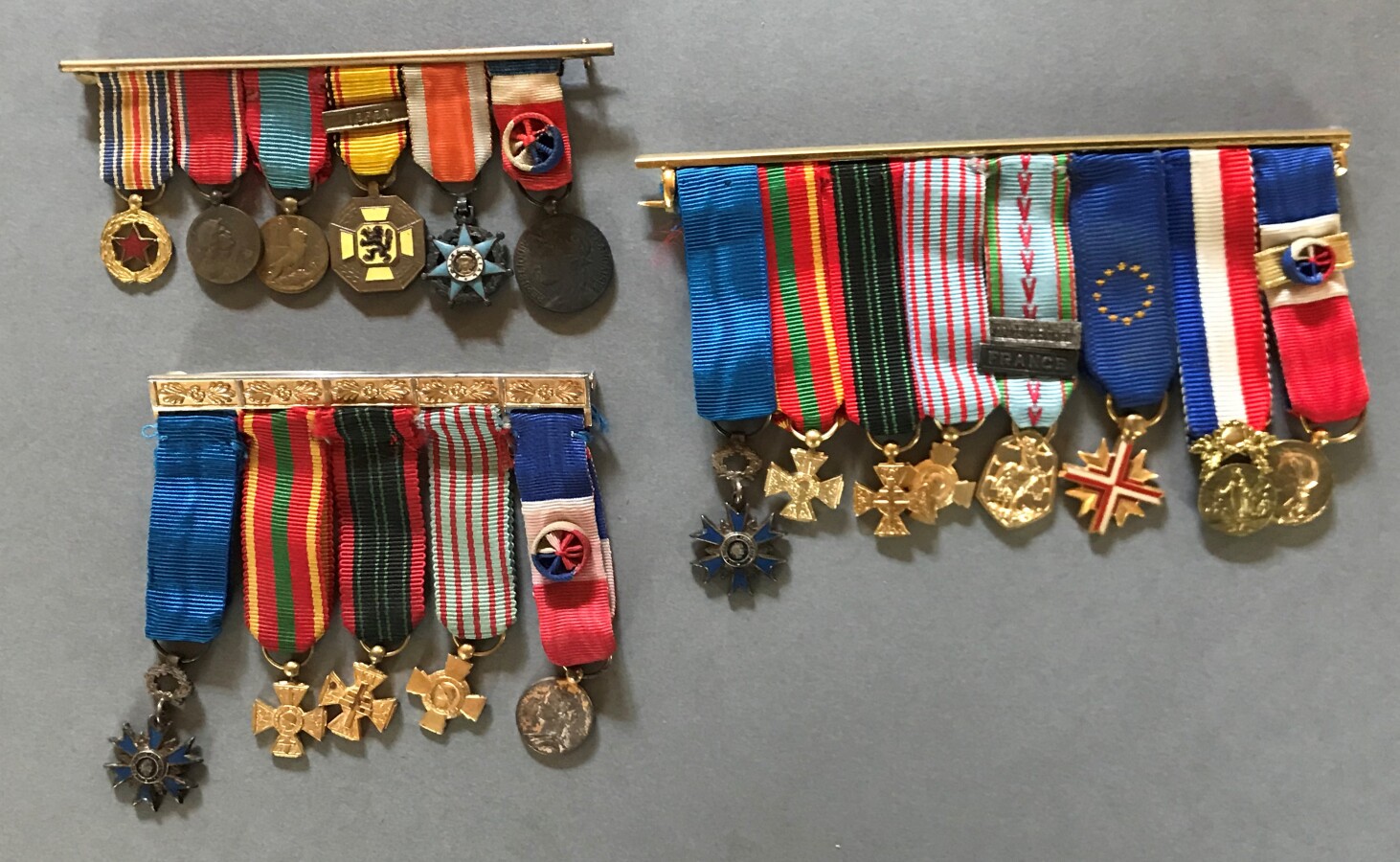 Ensemble comprenant 3 BARRETTES DE REDUCTIONS : BARRETTE DE 6 REDUCTIONS : INSIGNE DES BLESSES MILITAIRES, premier modèle ouvragé en métal doré et émaillé, MEDAILLE DE VERDUN, modèle gravé par Vernier en bronze patiné, MEDAILLE DES COMBATTANTS D'ARRAS, en bronze patiné, Belgique - CROIX FLAMANDE DES TROIS CITES, en bronze patiné et émaillé avec barrette " IEPER ", MERITE SOCIAL - ETOILE DE CHEVALIER, en bronze argenté et émaillé et MEDAILLE D'HONNEUR DU TRAVAIL, en métal argenté, 11 à 15 mm de diamètre TBE et 2 BARRETTES DE 5 ET 8 REDUCTIONS, fabrication récente, BE/TBE.