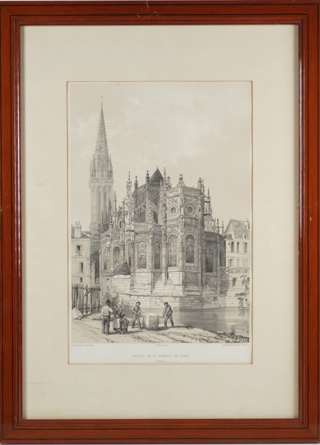 Ensemble comprenant 6 gravures et 1 aquarelle, certaines signées, représentant des vues d'architectures religieuses dont "L'église d'Hermonville", "Abbaye aux dames et église St Gilles", "Abbaye aux Hommes, Caen", "Abside de St Pierre de Caen", "Saint Etienne le Vieux", "Face Latérale de la Cathédrale de Reims" et "Eglise", dont 5 encadrées sous verre, allant de 28.5 x 20 à 29 x 39 cm (quelques usures).