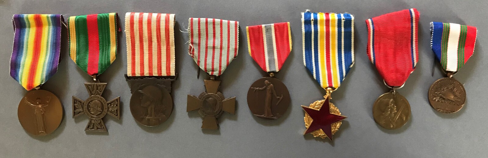 Ensemble comprenant 8 DECORATIONS : CROIX DU COMBATTANT (1930), en bronze patiné, MEDAILLE DE VERDUN (1916), en bronze patiné, modèle à anneaux gravé par Vernier, MEDAILLE INTERALLIEE DE LA VICTOIRE 1914-1918 (1922), en bronze patiné, modèle de la Monnaie de Paris gravé par Morlon, MEDAILLE COMMEMORATIVE DE LA GUERRE 1914-1918 (1920), en bronze patiné, MEDAILLE DES PRISONNIERS CIVILS DEPORTES ET OTAGES DE LA GRANDE GUERRE (1936), en bronze patiné, INSIGNE DES BLESSES MILITAIRES (1916), second modèle en métal doré et émaillé et MEDAILLE D'HONNEUR DE L'UNC, en bronze patiné, CROIX DU COMBATTANT VOLONTAIRE 1914-1918 (1935), en métal patiné, modèle de fabrication privée de la Maison MOURGEON sans date au revers, TBE.