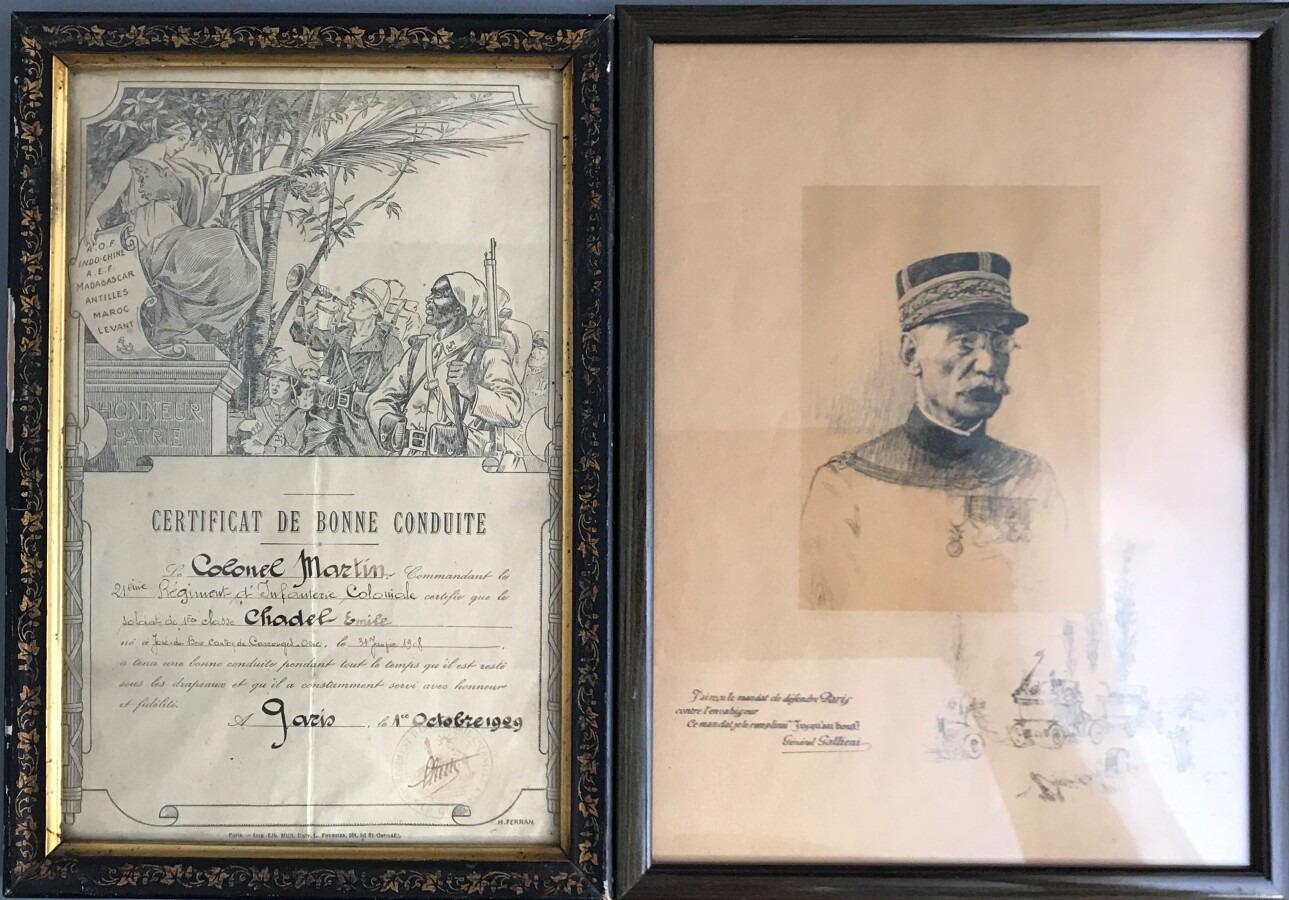 Ensemble comprenant CERTIFICAT DE BONNE CONDUITE et PORTRAIT DU GENERAL GALLIENI, 33 x 23 cm et 34 x 25 cm, encadrements sous verre, ABE à TBE.