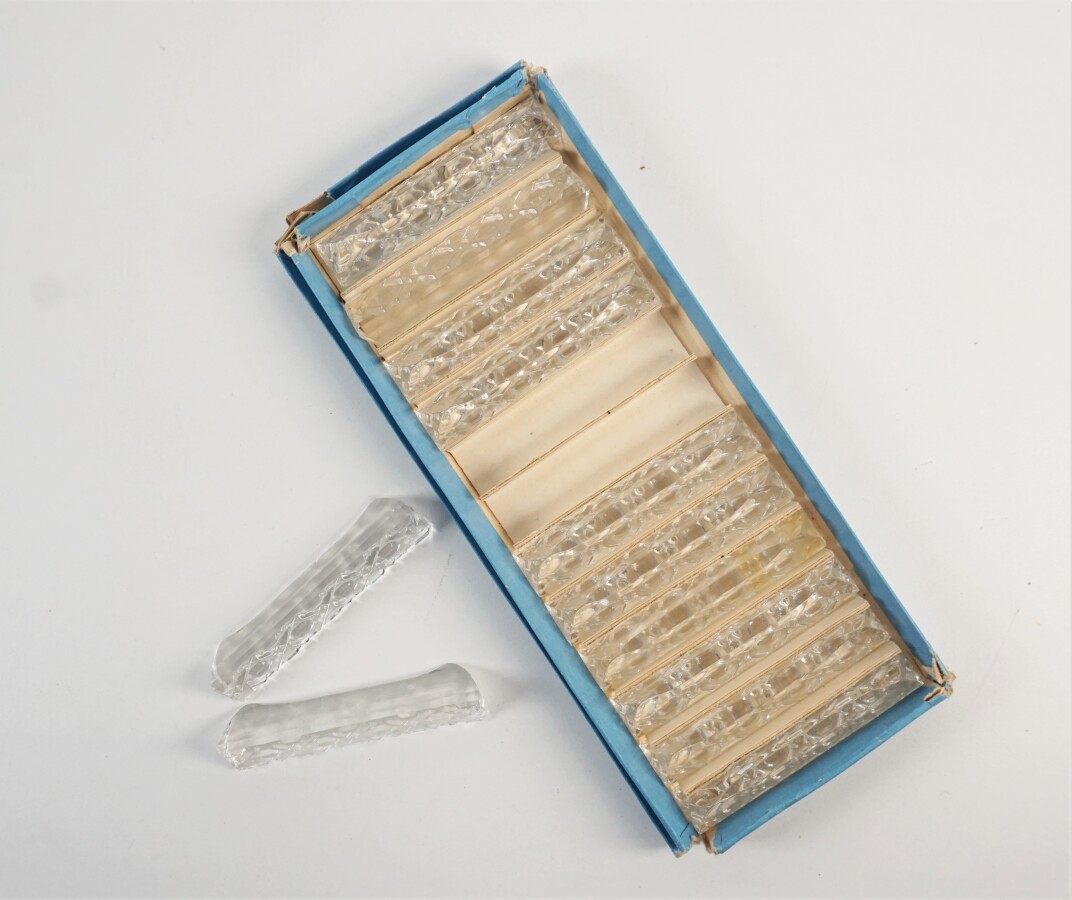 Ensemble comprenant : couvert à fromage, couvert à salade, couteaux à poisson, six couteaux dépareillés, 6 fourchettes et 6 cuillères dépareillées, modèle filet uniplat. On joint 12 porte-couteaux en verre taillé.