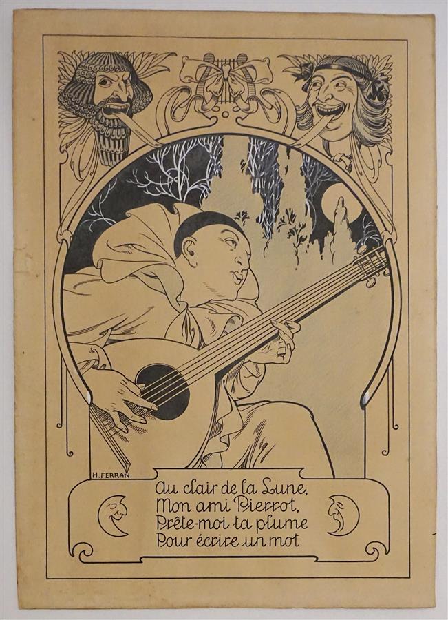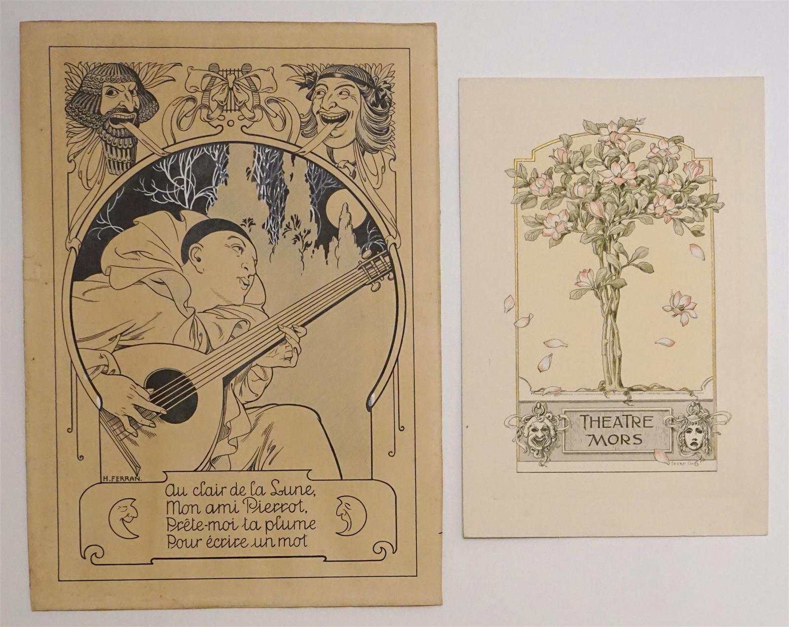 Ensemble comprenant : H. FERRAN, "Pierrot", dessin d'illustration, 30 x 21,5 cm et une plaquette "Théâtre Mors", 24 x 16 cm.