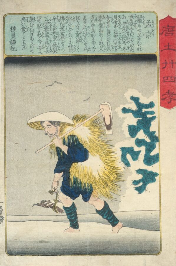 - une estampe de format oban tate-e représentant Meng Zong (Mô Sô) de la série des 24 paragons de piété filiale en Chine (Morokoshi nijushiko)