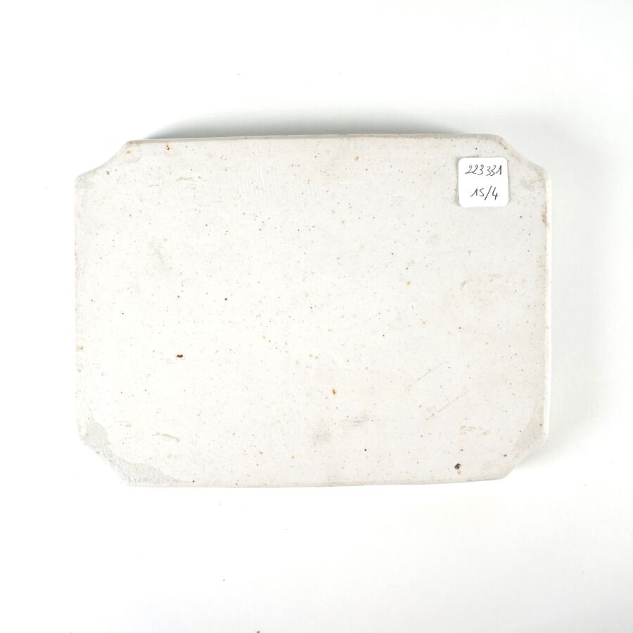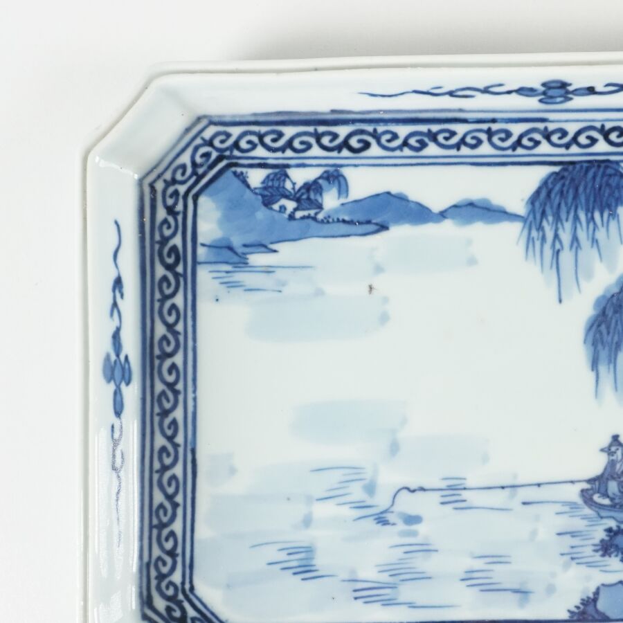 Ensemble comprenant trois plateaux / présentoirs octogonaux, porcelaine émaillée bleu blanc à décor des sept sages dans la forêt de bambou et paysage lacustre, Chine, circa 1880, L. 17.8 cm. 24.3 cm et 16 x 22.5 cm.