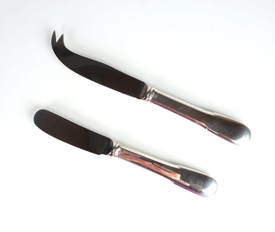 Ensemble comprenant un couteau à beurre et un couteau à fromage, les manches en argent, poinçon Minerve 1er titre, modèle uniplat, les lames en inox. Poids brut : 175 g environ.
