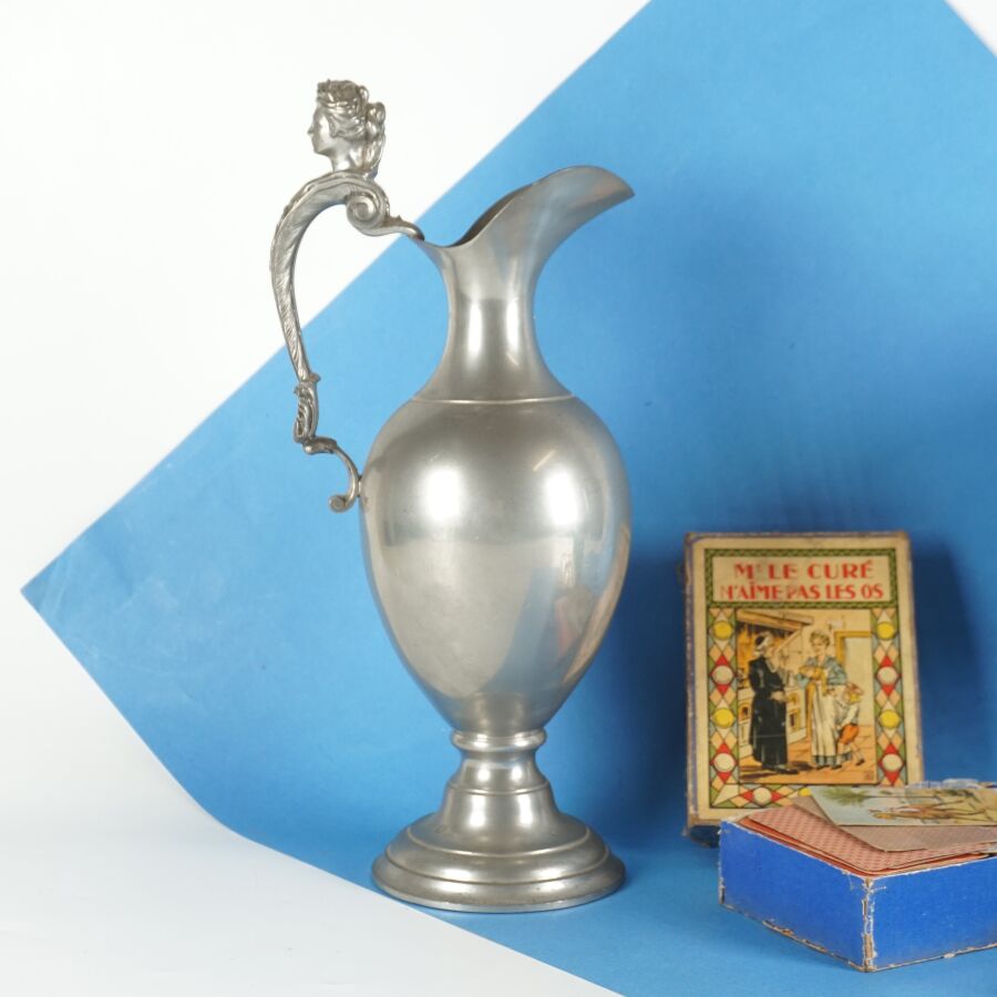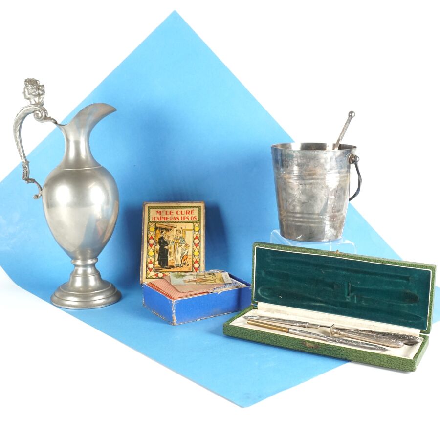 Ensemble comprenant un seau à glace à une anse, avec une cuillère ajourée, accessoires de bureau en métal argenté (coupe papier, porte mine, sceau), un jeu "Mr. Le curé n'aime pas les os" et une aiguière en étain, la anse ornée d'un buste de femme, H. Aiguière : 33 cm. H. Seau : 13.4 cm (traces).