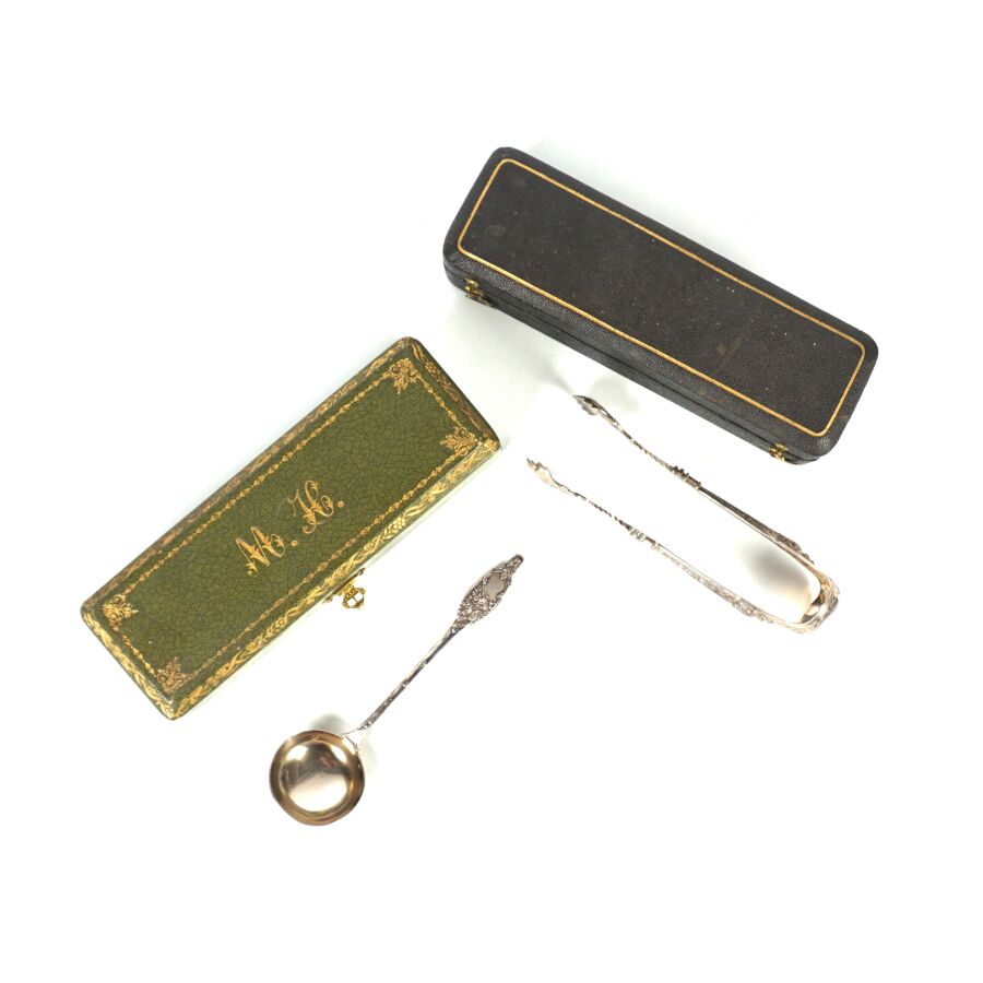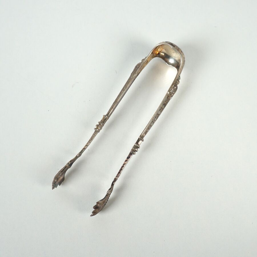 On joint une pince à sucre en métal argenté, prise à motif de griffes, présentée dans son coffret d'origine, L. 14 cm.