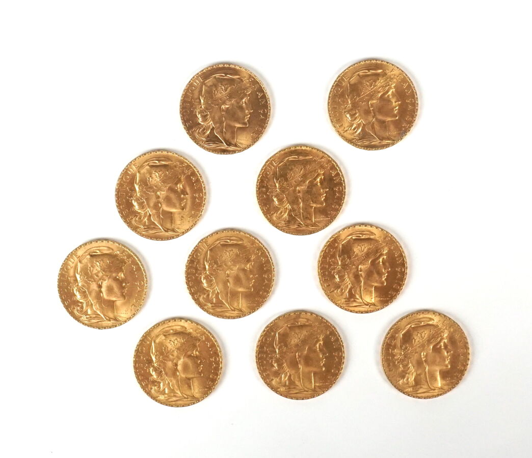 Ensemble de 10 monnaies 20 Francs or République française "Marianne coq", 1909, 2 x 1910, 2 x 1911, 3 x 1912 et 2 x 1914. Poids brut : 64.6 g environ.