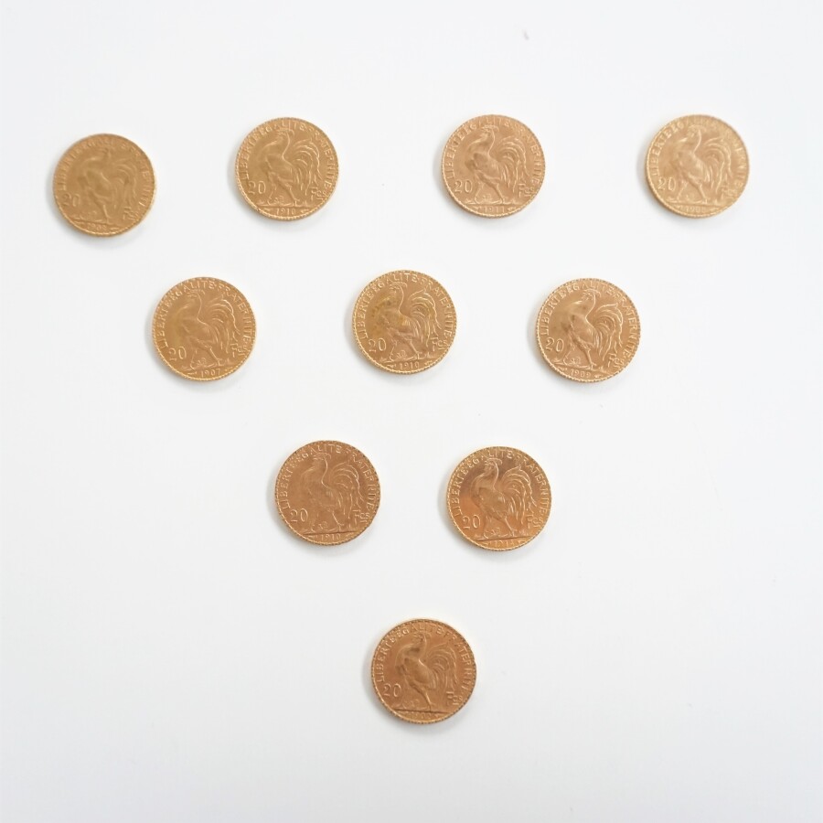 Ensemble de 10 pièces 20 Fr or République française "Marianne coq", comprenant : 1 x 1902 ; 1 x 1907 ; 1 x 1908 ; 2 x 1909 ; 3 x 1910 ; 1 x 1911 et 1 x 1914. Poids brut : 64.4 g environ.