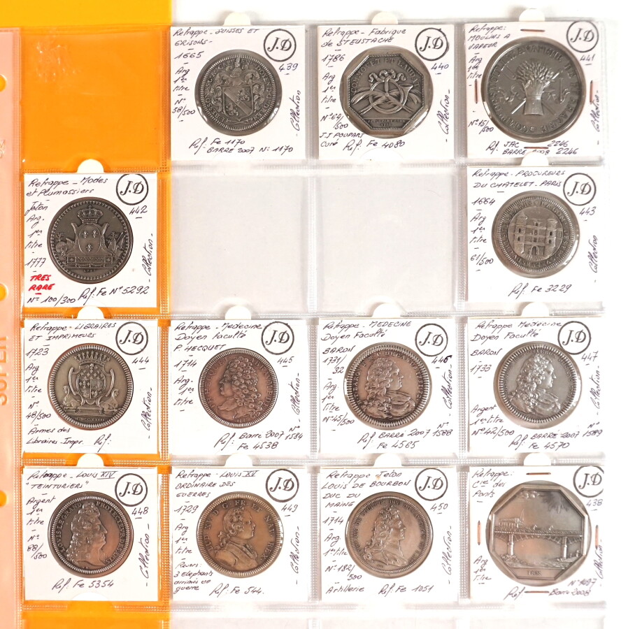 Ensemble de 13 jetons en argent, refrappe moderne : dont Louis XV, Louis XVI, Faculté de médecine et divers.