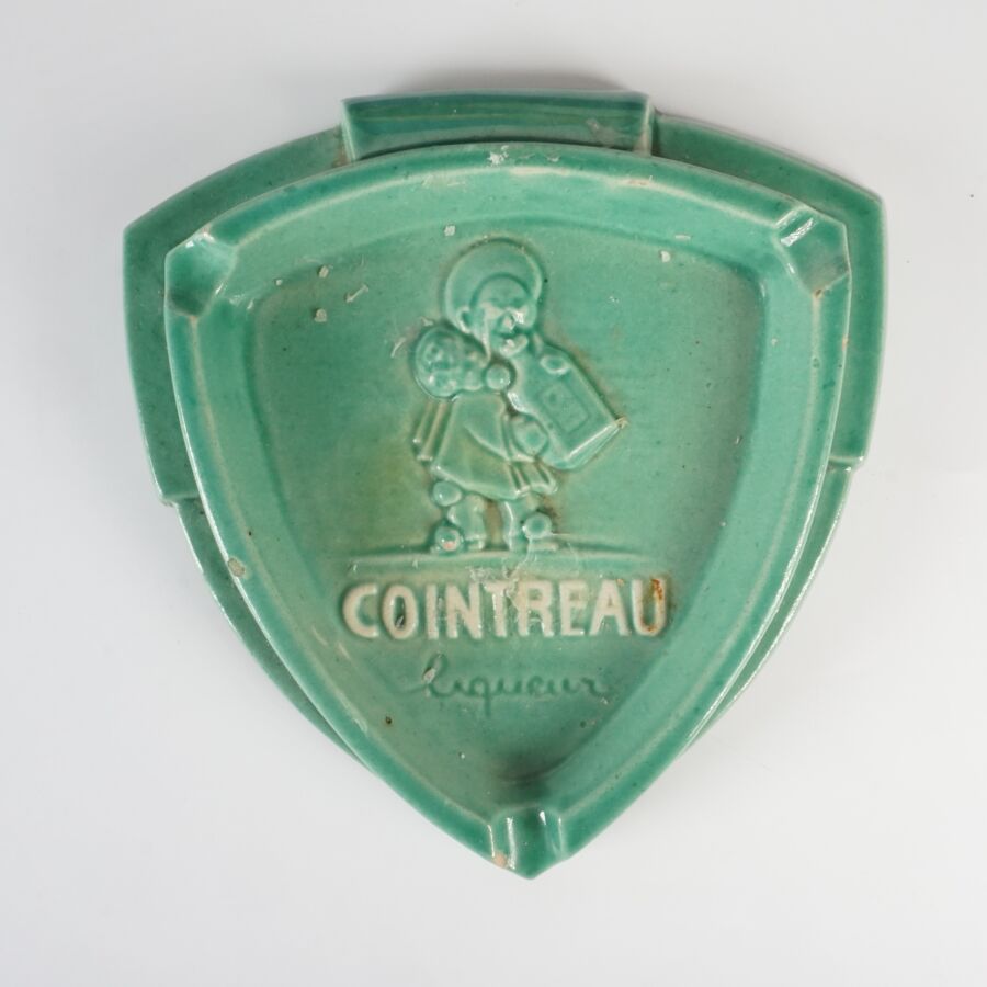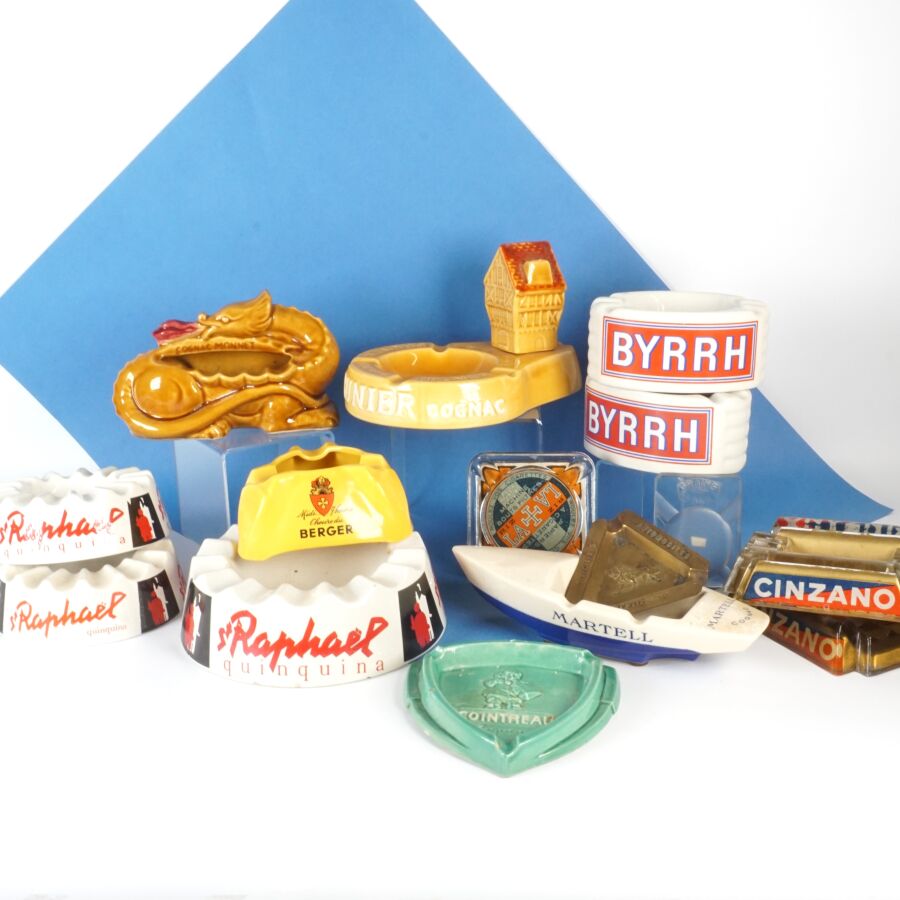 Ensemble de 15 cendriers publicitaires en verre moulé incolore et céramique émaillée polychrome à décor publicitaire, comprenant notamment St-Raphaël, Byrrh, Cognac Prunier, Martell Cognac, Cinzano, Cointreau, Peugeot, etc (quelques usures et égrenures).