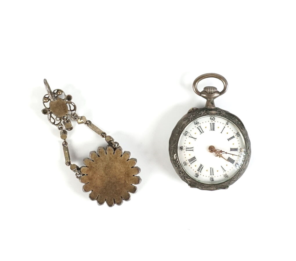 - une montre de poche à décor de fleurs, cadran émaillé blanc chiffres romains et arabes en noir, H. 4.2 cm, D. 2.8 cm. Poids brut : 19.4 g environ.