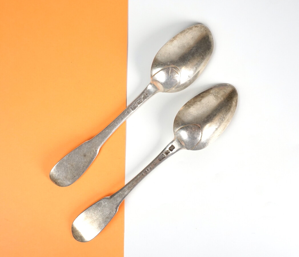 Ensemble de 2 cuillères en argent, poinçons aux Fermiers Généraux, Angers, l'une MO Jean JOUBERT (reçu maître à Angers vers 1760), l'autre MO O. DESTRICHE (reçu Maître à Angers en 1727). Poids brut : 124.8 g environ.