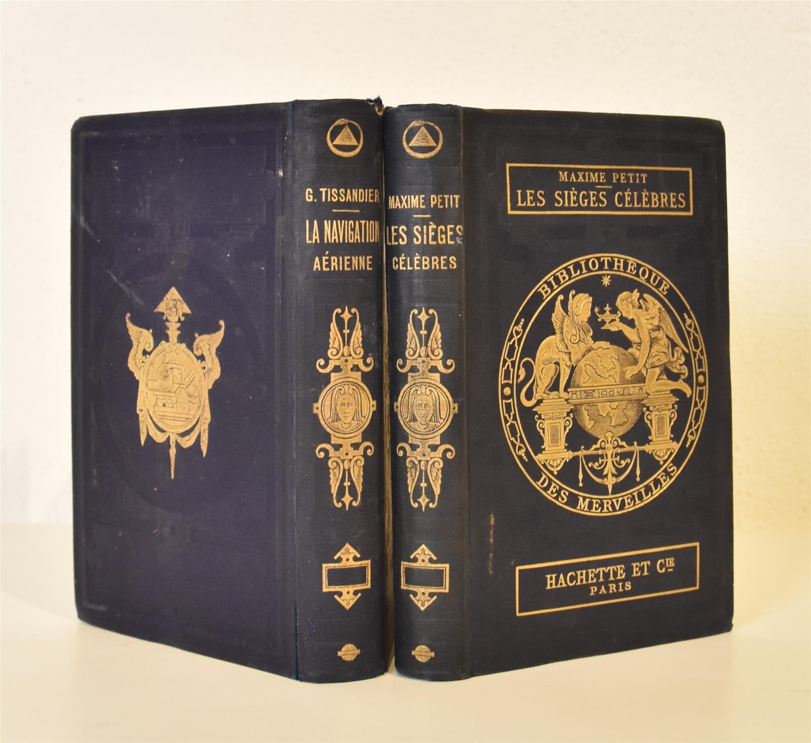 Ensemble de 2 livres In-12° édités à Paris, chez Hachette et Cie, Collection Bibliothèque des Merveilles, 1881 et 1886 - PETIT (Maxime) - Les sièges célèbres - TISSANDIER (G.) - La navigation aérienne - Quelques rousseurs - Des illustrations gravées in et hors-texte - Reliures éditeur percale marine ornées d'1 décor central doré aux 1ers plats - Tranches rouges - Bons exemplaires.