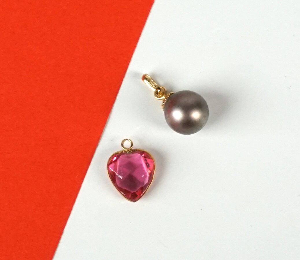 Ensemble de 2 pendentifs en or jaune 18K (750/oo), l'un retenant une perle de Tahiti, H. 1.5 cm, l'autre un coeur en verre rose, H. 1.2 cm. Poids brut : 1.7 g environ.