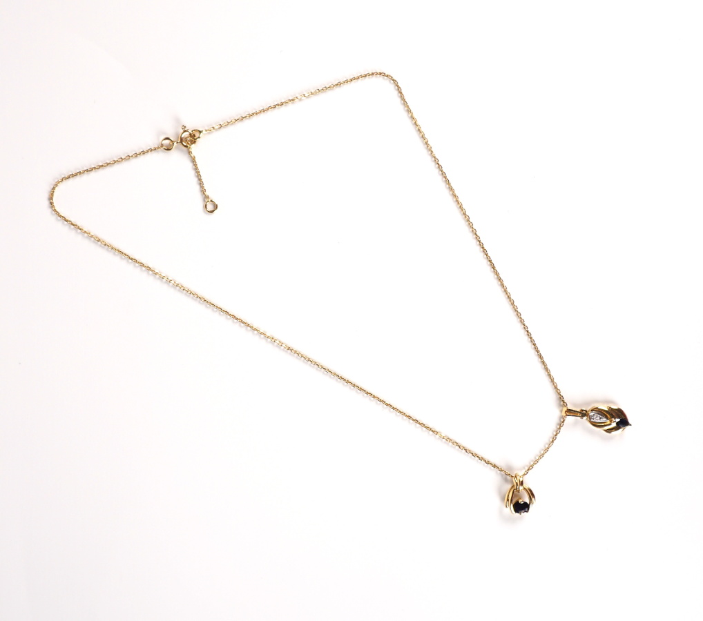 Ensemble de 2 petits pendentifs en or jaune 18 K (750/oo) agrémentés chacun d'un petit saphir. On joint une chaine maille forçat en or jaune 18K (750/oo), L. de 37 cm à 40 cm. Poids brut : 4.2 g environ.