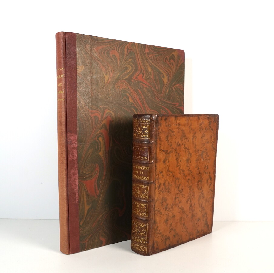 Ensemble de 2 volumes : ABOT DE BAZINGHEN - Traité des Monnoies et de la juridiction de la Cour des Monnoies, en forme de dictionnaire, qui contient l'Histoire des Monnoies des anciens Peuples Juifs, Gaulois & Romains, [] - Paris ; Guillyn, 1764 - 1 volume In-4° (sur II, ici le tome II) - 46 pages sous forme de tableaux dépliants - Reliure de l'époque veau havane marbré (habillement restaurée) - Dos à nerfs orné - Pièce de titre maroquin bordeaux - Tranches rouges - Bon exemplaire bien qu'incomplet en édition originale - [DEWAMIN (Émile)] - Cent ans de numismatique française de 1789 à 1889 ou A, B, C de la numismatique moderne [] - Paris ; L. Larger, 1898-1899 - 1 volumes In-folio (sur 3, ici le tome III, volume de 93 planches photographiques hors texte - Quelques rousseurs éparses - Reliure légèrement postérieure demi-toile bordeaux - Dos titré or - Très bon exemplaire bien qu'incomplet de son texte.