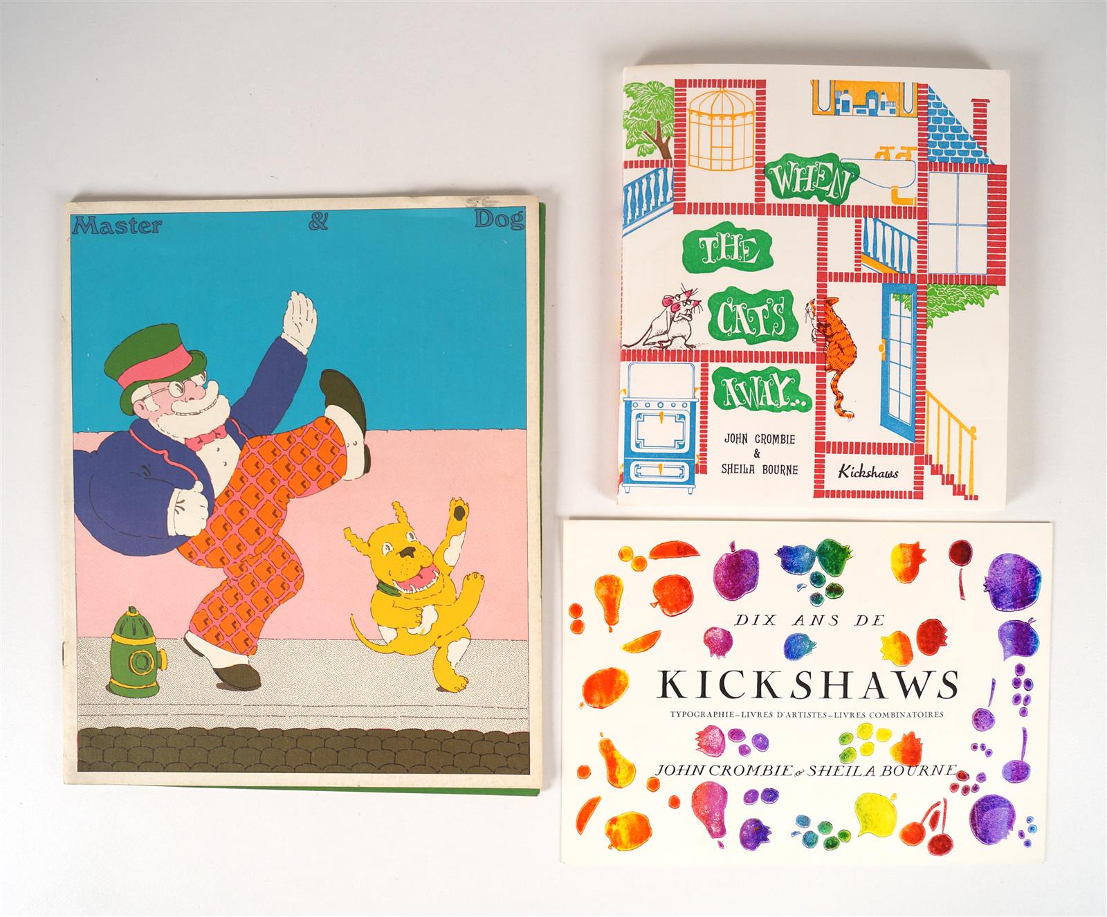 Ensemble de 2 volumes : CROMBIE (John) - BOURNE (Sheila) - When the cats away - Paris ; Kickshaws, 1983 - 1 volume petit In-8° broché sous couverture illustrée couleurs - Amusantes illustrations couleurs de Sheila Bourne - Très bon exemplaire en édition originale numérotée et signée des auteurs sur BFK Rives (n°33 sur les 50 de tirage total) - On y joint : Le carton d'1 vernissage des auteurs intitulé Dix ans de Kickshaws - The Push in Monthly Graphic. Master & Dog N° 57 - New York ; The Push Pin studio, 1972 - 1 volume In-4° agrafé - Couverture illustrée, illustrations couleurs - Bon exemplaire.