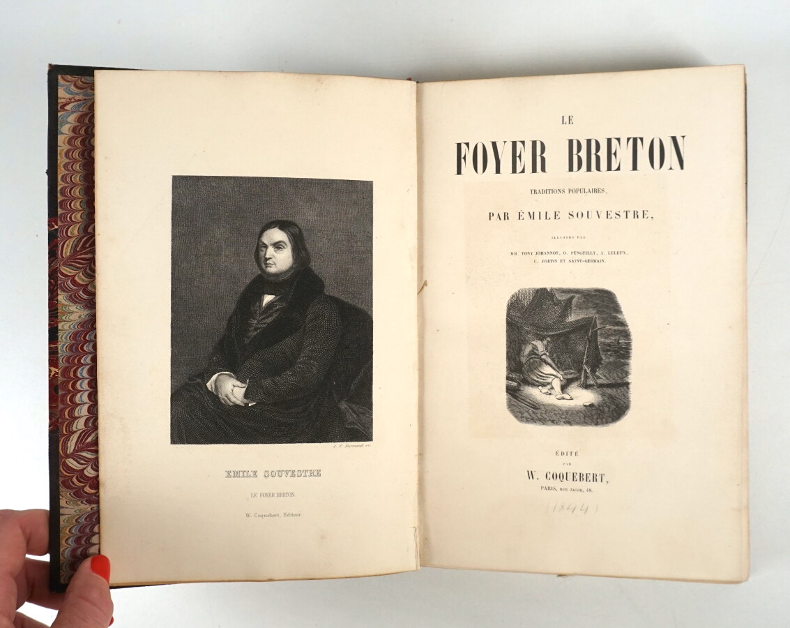Ensemble de 2 volumes : SOUVESTRE (Émile) - Le foyer breton. Traditions populaires - Paris ; W. Coquebert, [1846] - 1 volume In-8° - Portrait frontispice, figures in texte et planches gravées sur acier hors texte (1 détachée) d'après Tony Johannot, O. Penguilly, A. Leleux, C. Fortin et Saint-Germain - Reliure postérieure demi-maroquin prune à coins (des frottements minimes, 1ère charnière fendue et dos décollé) - Dos à nerfs titré or - Tête dorée - On y joint : GRUYER (Paul) - Les Saints bretons - Paris ; Henri Laurens, [vers 1923] - 1 volume In-12° - Relié à la suite : DU MÊME - Les calvaires bretons - Paris ; Henri Laurens, [vers 1923] - Nombreuses illustrations photographiques - Reliure de l'époque cartonnage beige à la Bradel illustré au 1er plat - Dos titré à l'encre - Tête dorée - Bon ensemble.