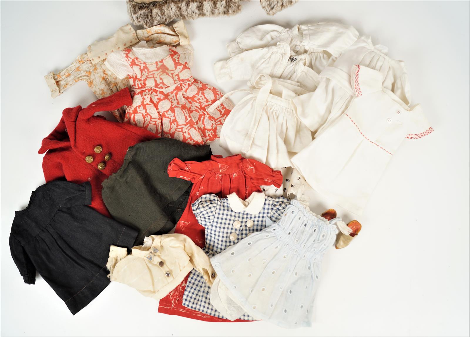 Ensemble de 20 vêtements taille Bleuette, une paire de chaussures et trois chapeaux, dans une petite malle.