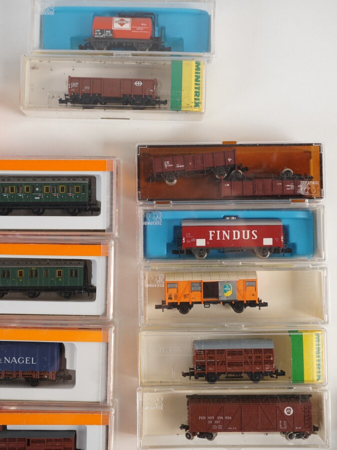 Ensemble de 27 trains miniatures, diverses références, et diverses marques telles que ARNOLD, MINITRIX, RIVAROSSI, etc., dans leurs boîtes d'origine (usures).