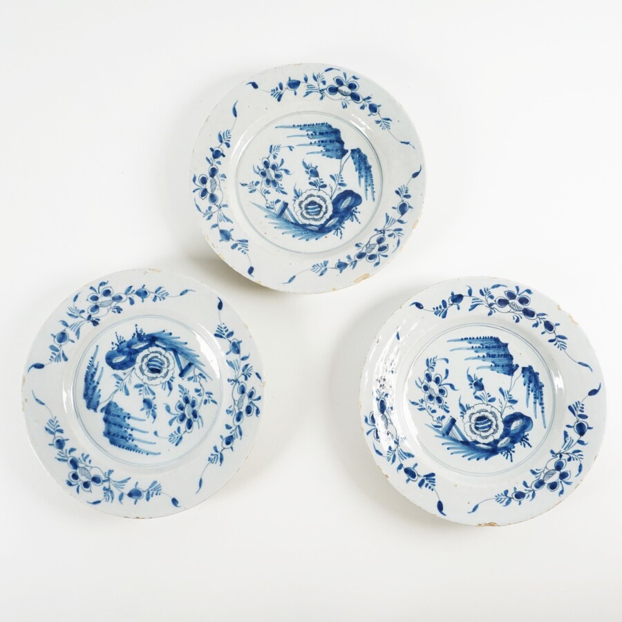 Ensemble de 3 assiettes, faïence émaillée en camaïeu de bleu sur fond blanc, à décor de fleurs, D. 23 cm (égrenures).