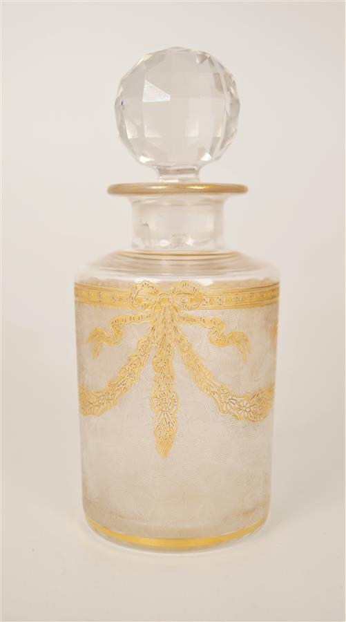 Ensemble de 3 flacons en verre, à décor de guirlandes fleuries rehaussées à l'or, H. de 16 à 19 cm (petits éclats aux bouchons, l'un accidenté).
